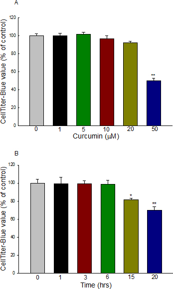 μM did not affect the viability of the ARPE-19 cells. B: Time effect of curcumin on cells treated with 20 μM curcumin at different time points. Cells treated with curcumin (20 μM)