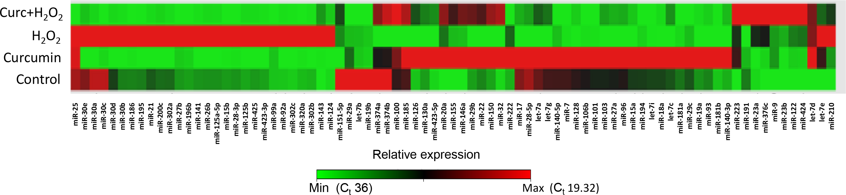[H2O2], and curc+H2O2) relative to an average of four housekeeping genes. ARPE-19 cells were treated with 20 μM curcumin and 200 μM H2O2 for 6 and 18 h, respectively. In the curc+H2O2 group, the cells were treated with curcumin for 6 h before H2O2 insult for 18 h. Cells with vehicle DMSO were used as control. Each vertical line in the heatmap represents a single miRNA,