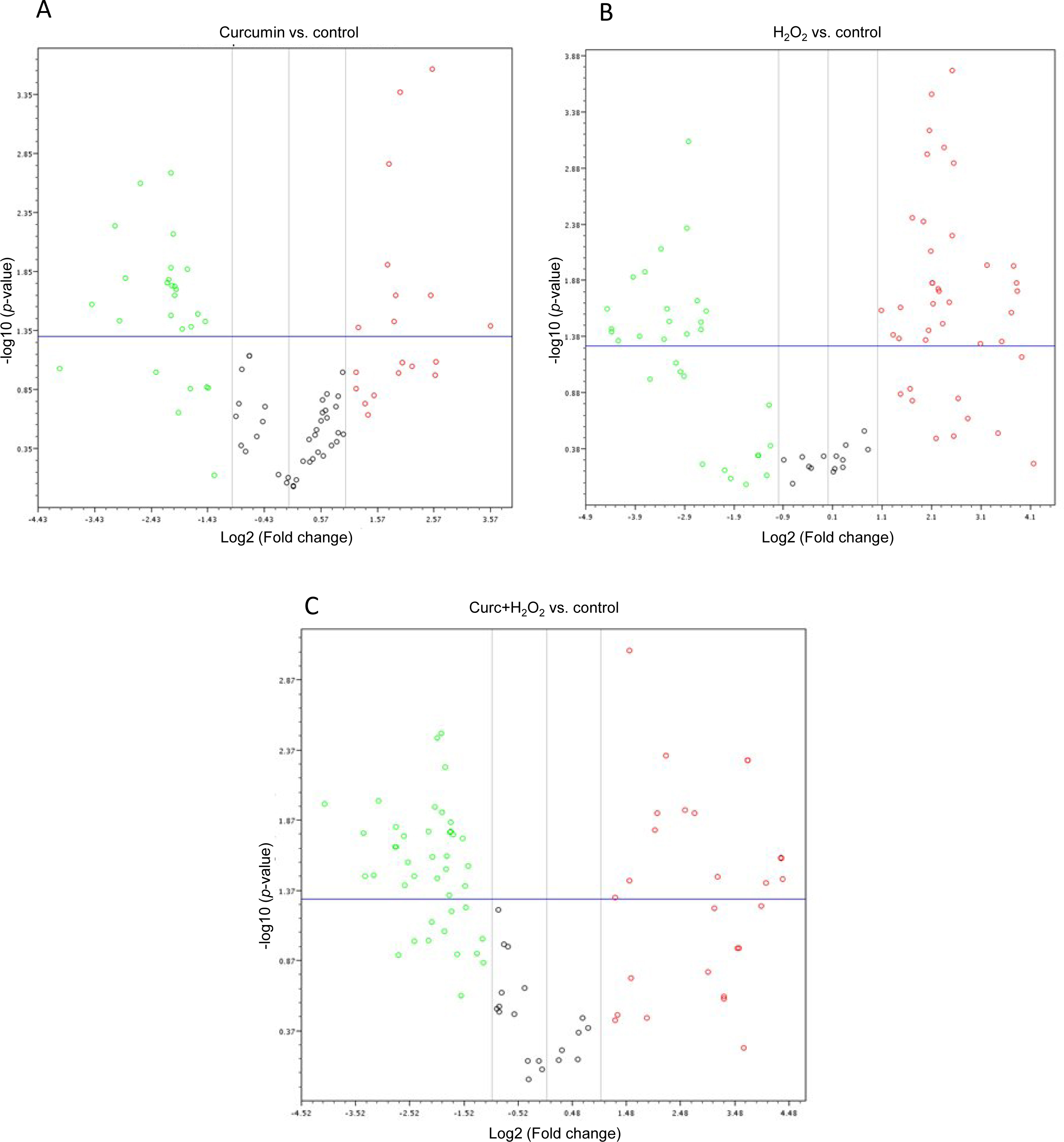 Figure 3. Volcano plot of significance against the relative expression differences between the control and treated groups (A–C). Each dot represents one of the 81 microRNAs (miRNAs) that was filtered and had detectable expression in either treatment.