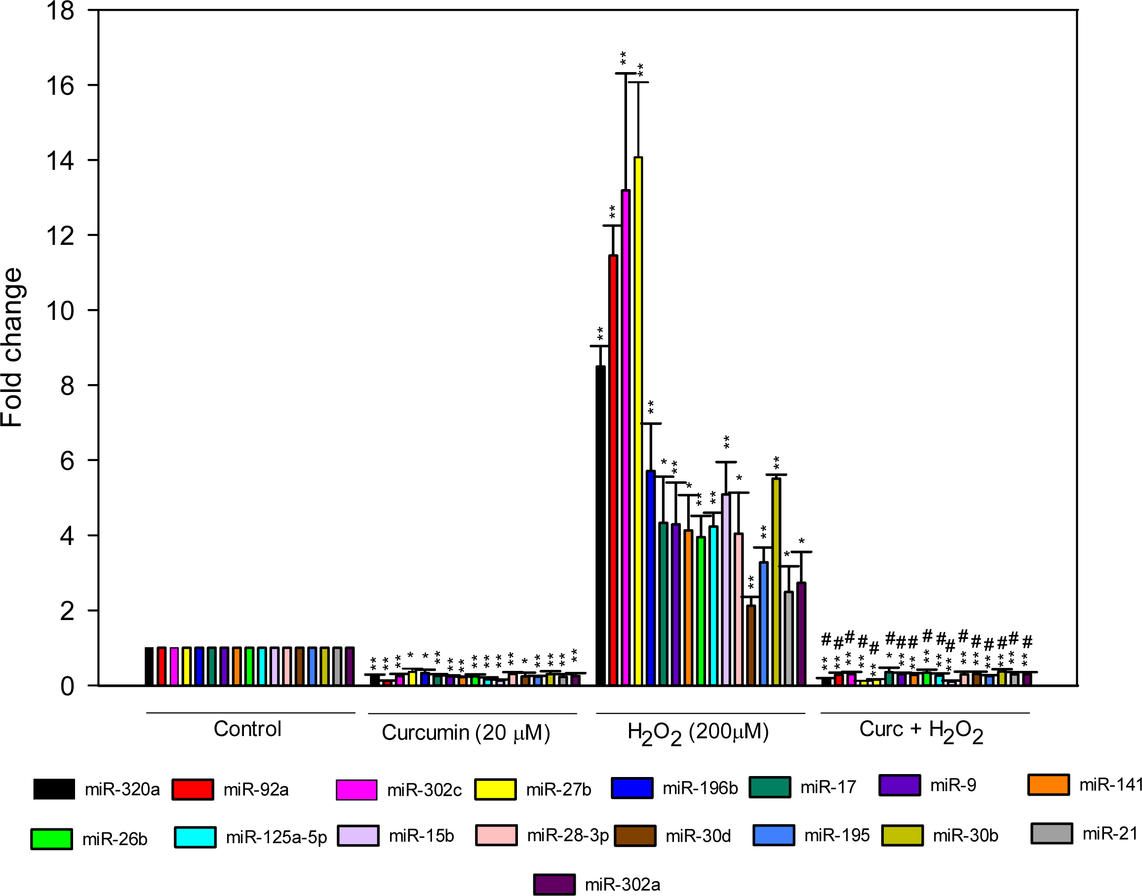 the cells were insulted with 200 μM H2O2 for 18 h. The curcumin pretreatment significantly suppressed the H2O2-induced expression of 17 microRNAs (miRNAs) compared to controls. Data represent mean±SEM from three separate samples. *p<0.05