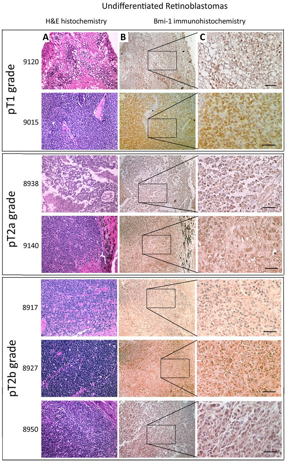 retinoblastomas grouped according to Tumor, Nodes, Metastasis (TNM) classification. A: Retinoblastoma sections were stained by hematoxylin and eosin.B: Magnified images in C: intense nuclear BMI-1 expression in undifferentiated retinoblastomas. Scale bars: 50 µm.