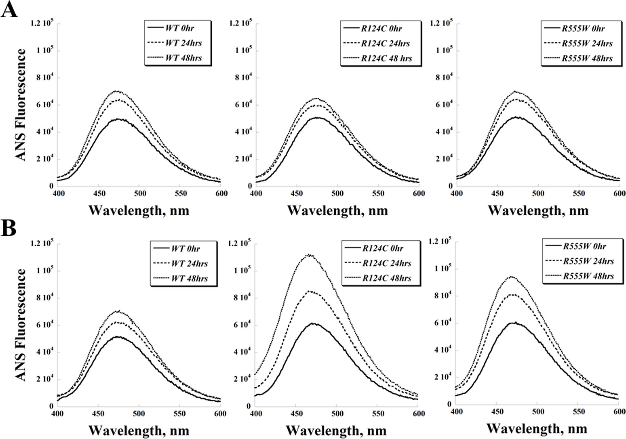protein. A: The 1-anilinonaphthalene-8-sulfonic acid (ANS) fluorescence spectra of wild-type (WT), R124C, and R555W proteins incubated