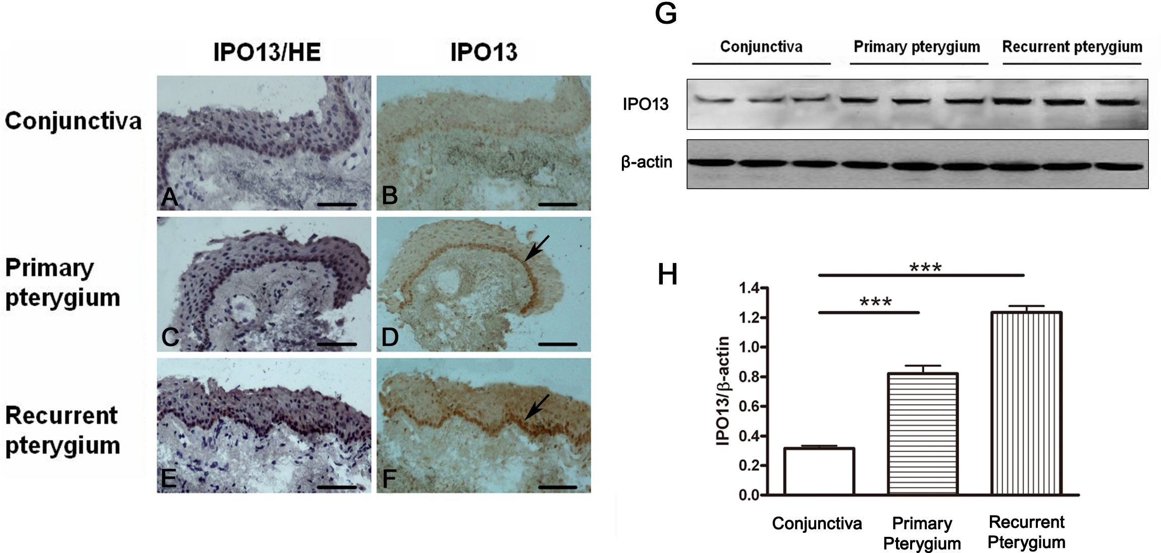 It was shown that the expression of IPO13 in the basal layer of epithelium cells was apparently increased (D, F; as arrows indicated), compared to the normal conjunctiva (B). G and H demonstrate representative images and statistical analysis of western blotting results of IPO13 in the normal conjunctiva,