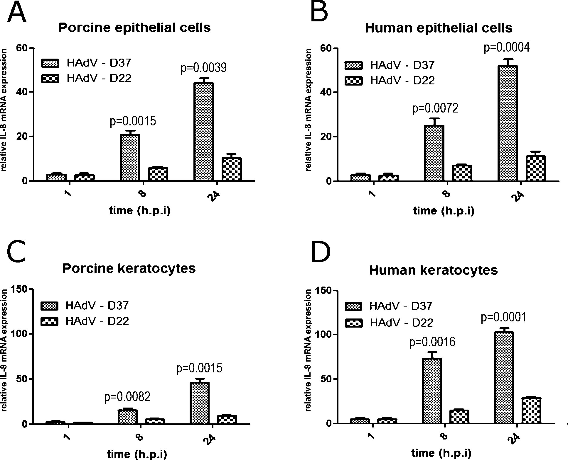 and non epidemic keratoconjunctivitis–type human adenovirus-D22. Primary porcine corneal epithelial cells, PPCE (A), primary human corneal epithelial cells PHCE (B), primary porcine corneal keratocytes PPCK (C), and primary human corneal keratocytes PHCK (D), respectively (unpaired, two-tailed Student t test). Increase of interleukin-8 (IL-8) messenger ribonucleic acid (mRNA)