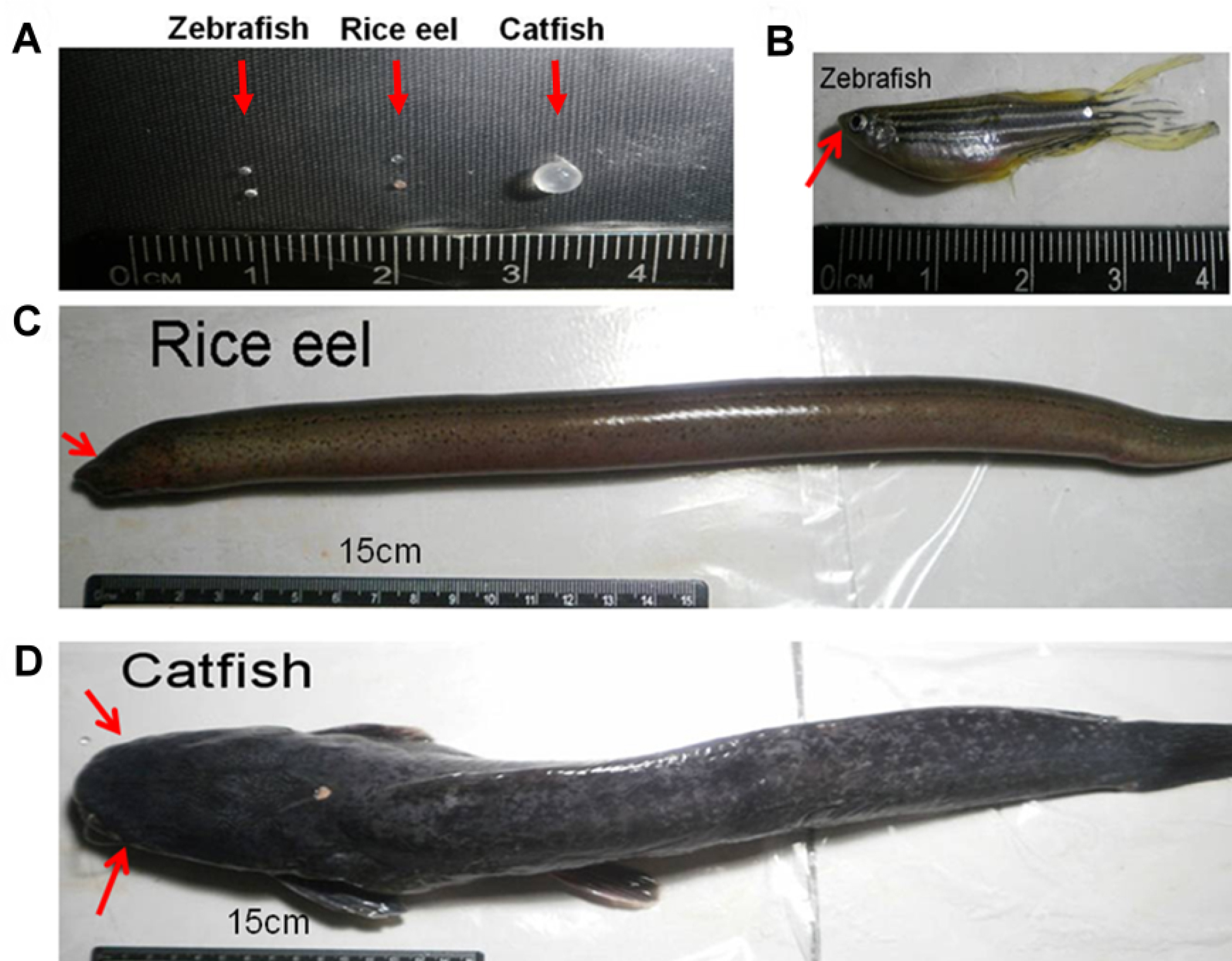 Body-size comparison among (B) zebrafish (C) rice eel and (D) catfish. The arrows indicate the location of eye lenses.