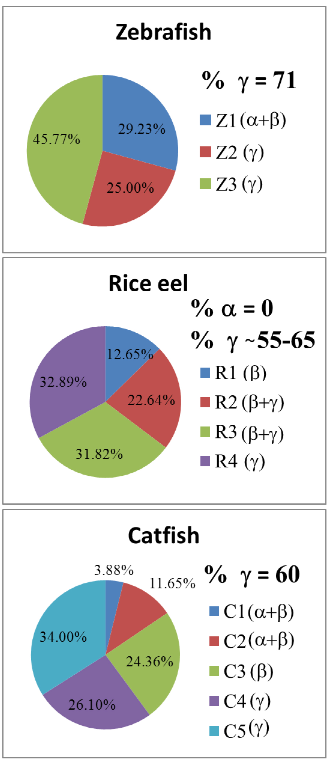 estimated to be 71%, ~55-65% and 60% for zebrafish, rice eel, and catfish, respectively, by peak areas calculated from