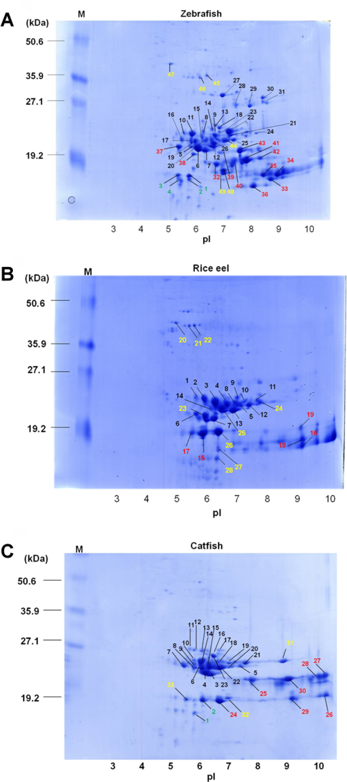 C) catfish. Total protein (200 μg) in each sample was loaded onto immobilized pH gradient (IPG) gel strips (pH 3–10 Nonlinear,