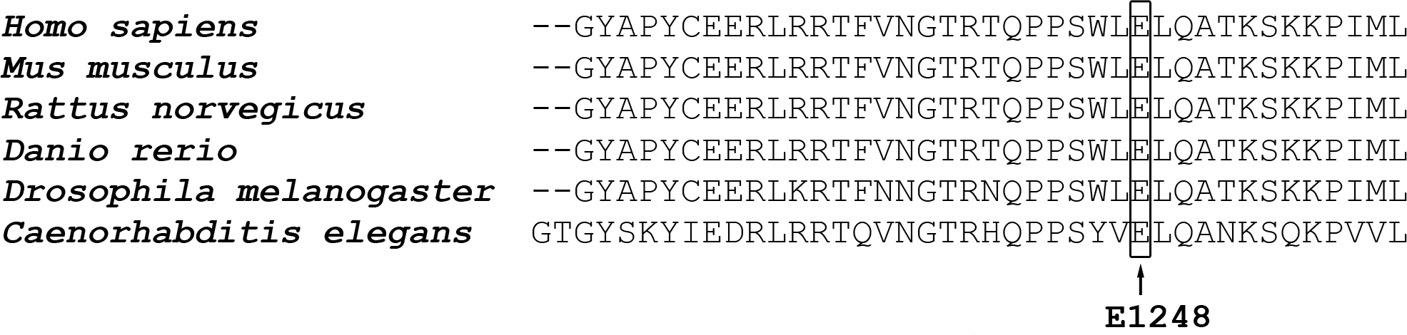 Alignment of the amino acid sequences of the first MyTH4 domain of myosin VIIA from different species. The arrow indicates the highly conserved E1248 residue.