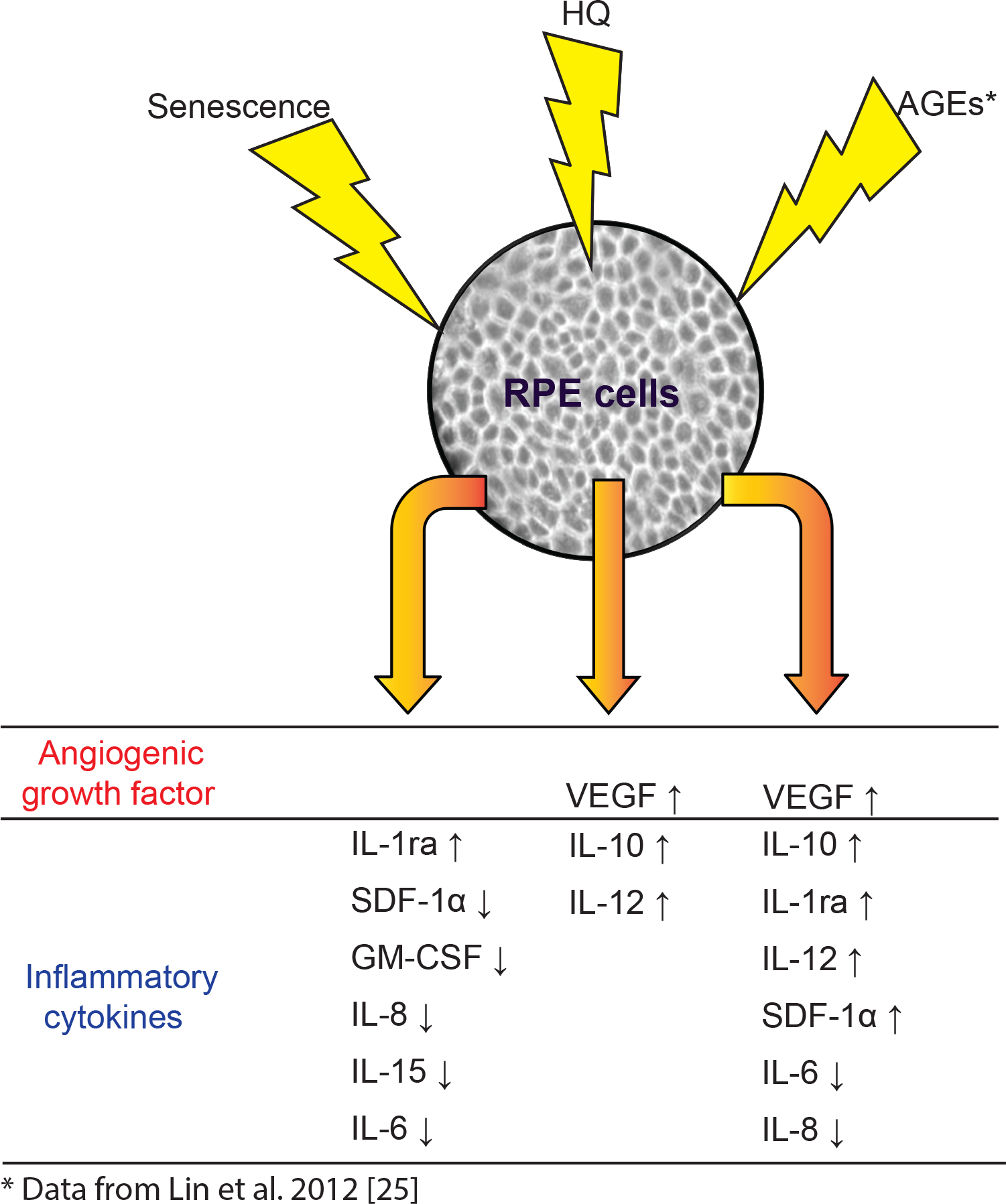 Figure 7. Summary schematic of secretion profiles from RPE under different stimulations: HQ, passage- related senescence, and AGEs.