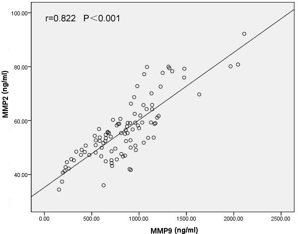 Figure 3. Correlation analysis showing that the serum MMP2 concentrations were positively correlated with serum MMP9 concentrations