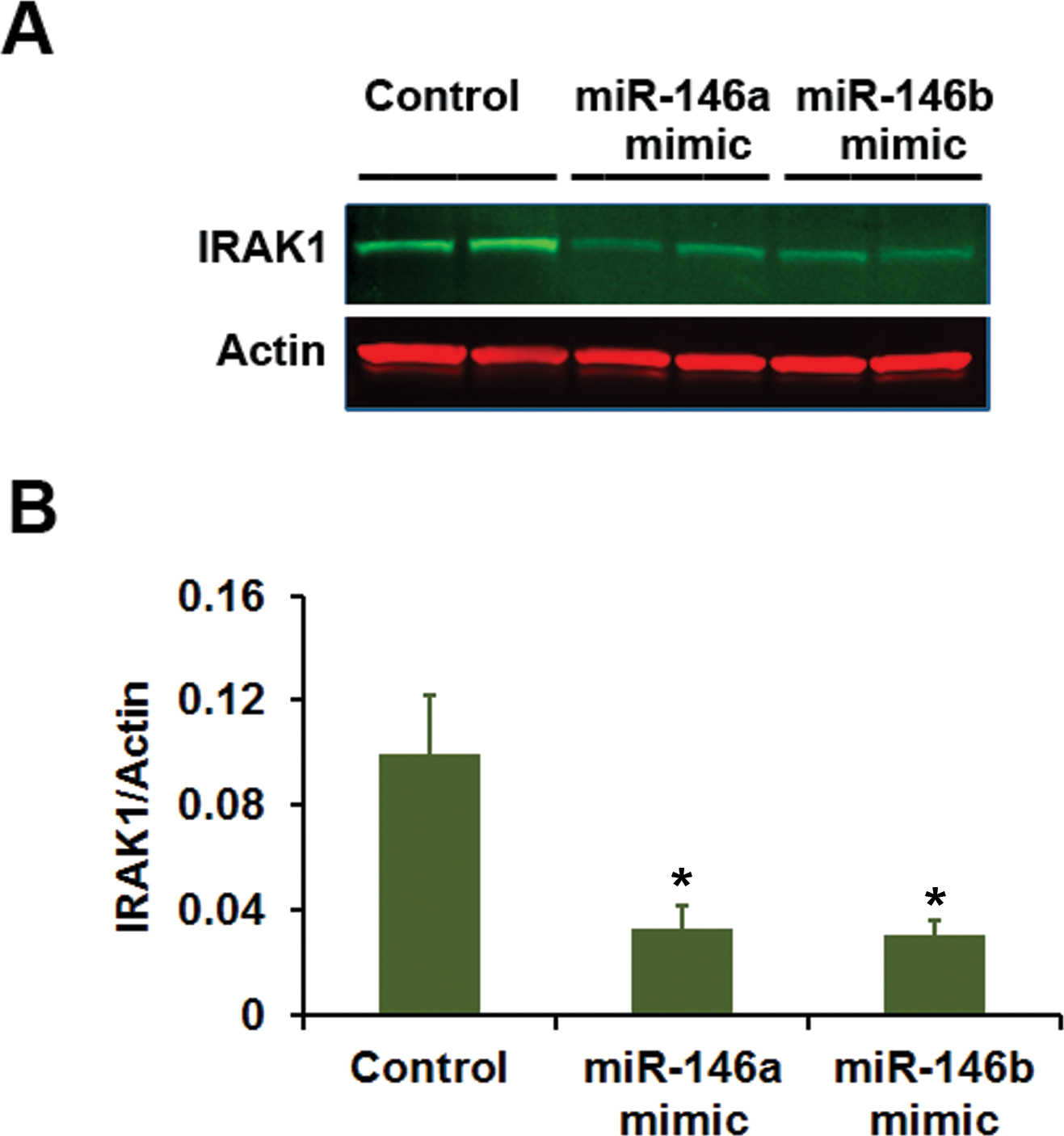 transfected with microRNA (miRNA) mimics for 72 h. A: Western immunoblot analysis of IRAK1 expression. Cells were treated with control miRNA mimic (random sequence), miR-146a