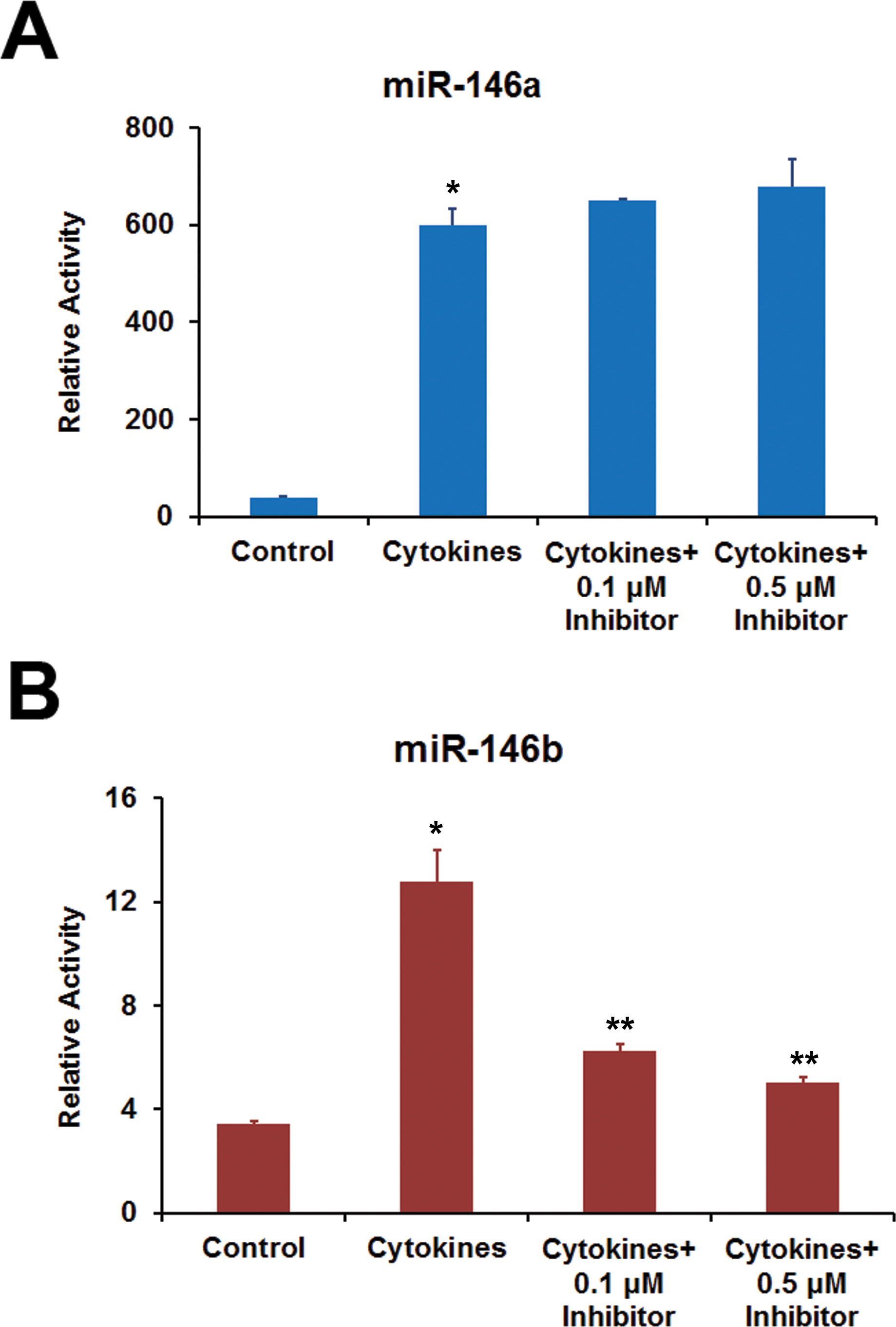 Figure 9. The activation of MIR146A promoter by proinflammatory cytokines in ARPE-19 cells was not affected by JAK inhibitor 1, while that of the MIR146B promoter was effectively blocked. The cells were transfected with promoter-luciferase constructs of MIR146A or MIR146B, and treated with a mixture of interferon (IFN)-γ (100 u/ml), tumor necrosis factor (TNF)-α (10 ng/ml), and interleukin (IL)-1β