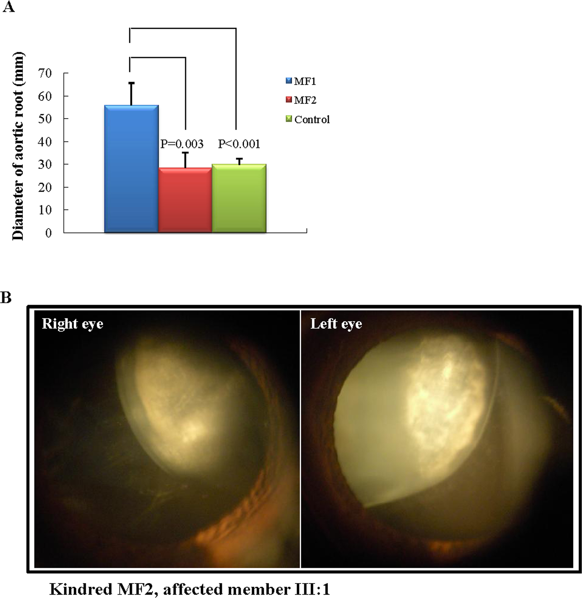 MF1 (n=6) and group MF2 (n=3), and between group MF1 and controls (n=5). Error bars represent standard deviation. B: Ophthalmic examination of anterior segments shows a bilateral lens dislocation in individual III:1 of kindred MF2.