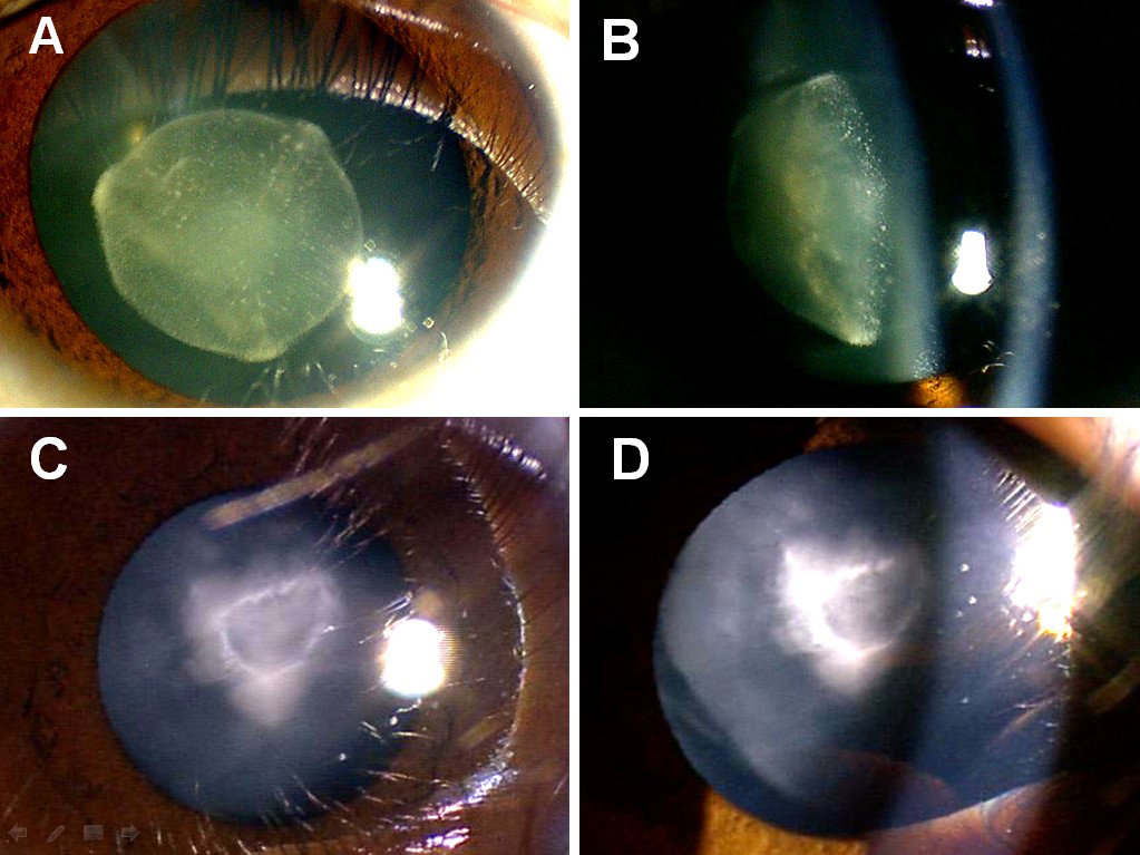 Slit-lamp photograph of the family members who had congenital nuclear and zonular pulverulent cataracts with Y-sutural opacities. The affected member IV:2 (