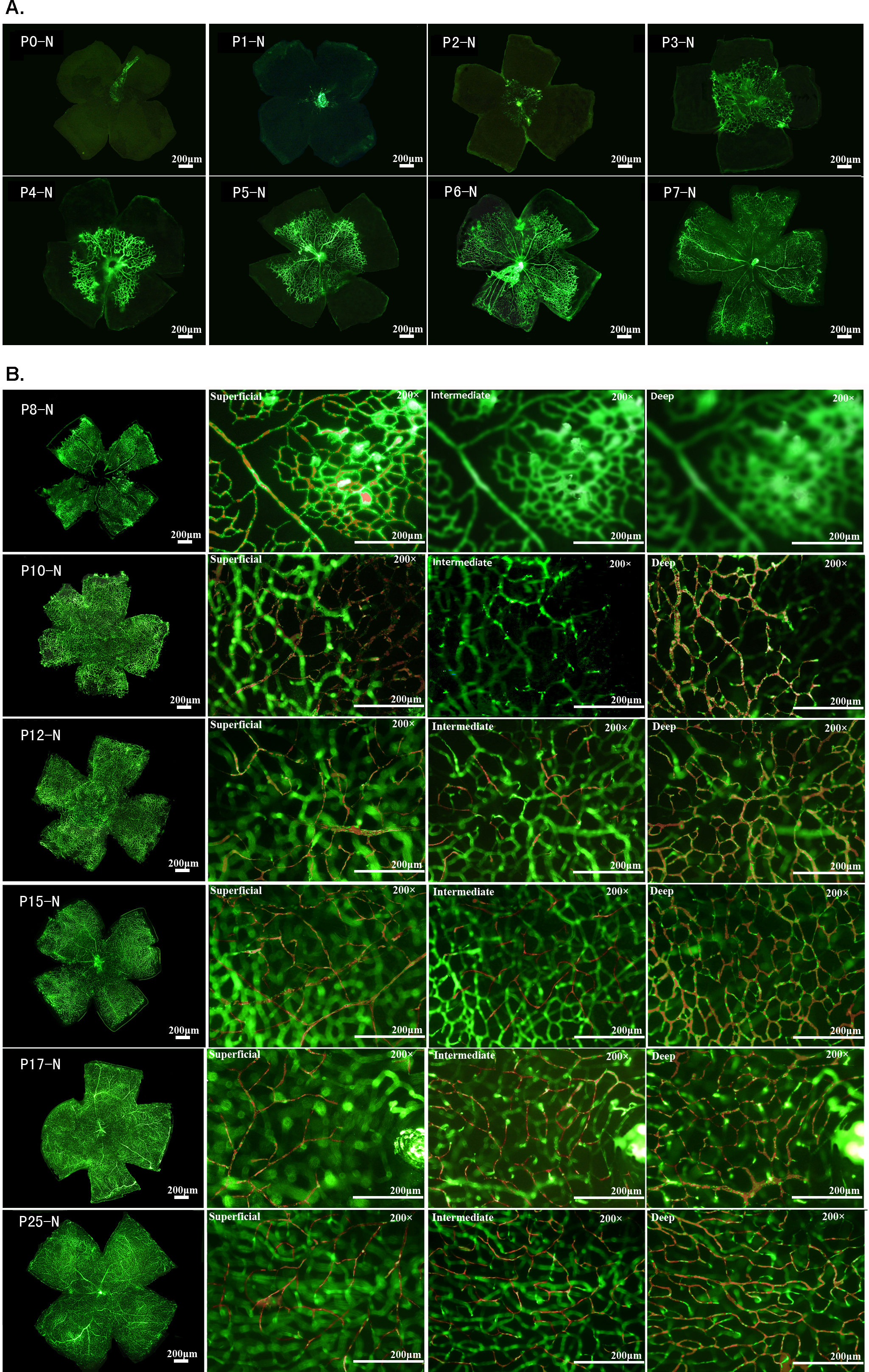 intermediate, and deep vascular plexuses were seen all over the retina. After P21, the retinal vessel network was obviously