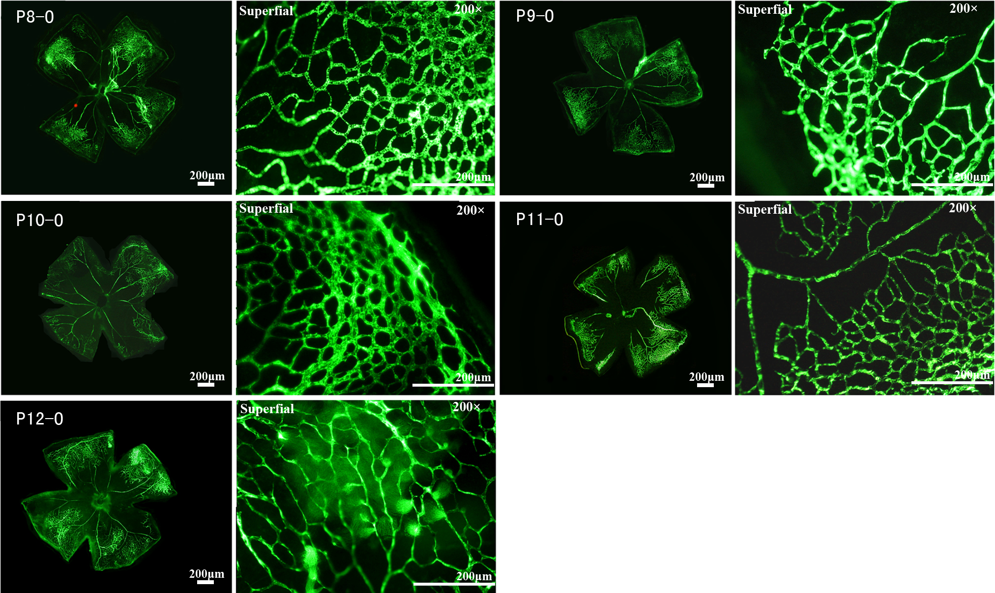 P12. From P8 to P12, only the superficial retinal vascular network was observed, but initiated vascular sprouts were sometimes