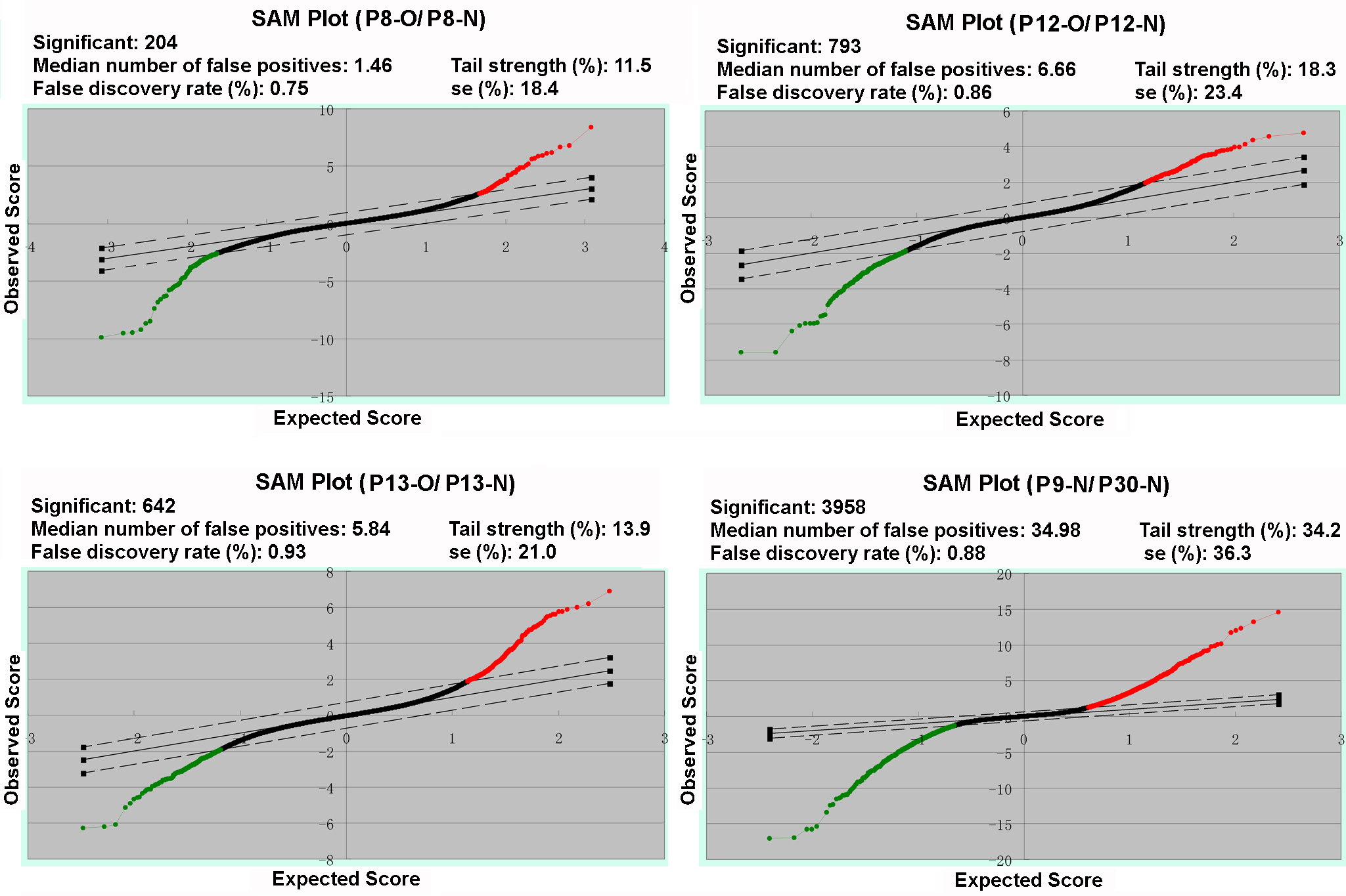 Figure 4. Statistical analysis of microarray (SAM) plots of four comparison pairs. Three arrays were included in each group. The two