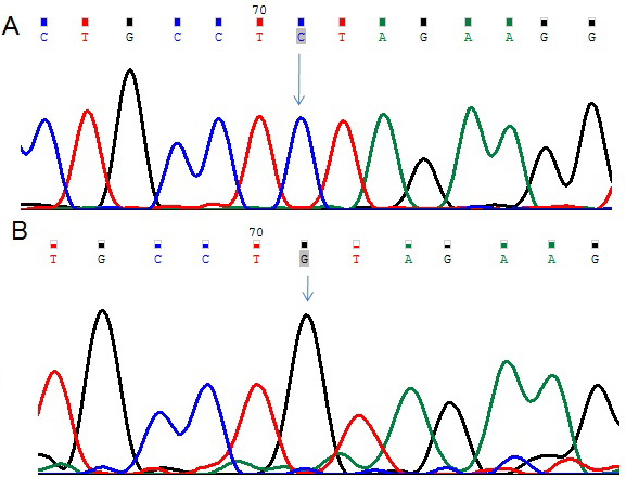 B: The sequence derived from the patient with congenital glaucoma shows the homozygous C>G (g.75070493C>T nucleotide change,