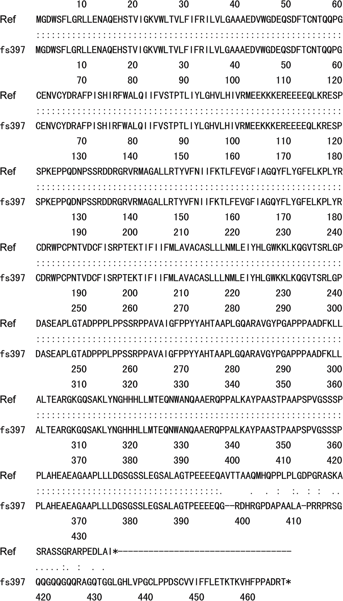 Figure 4. The alignment of the deduced GJA3 amino acid sequence of reference and CX46A397fs mutant. The 1361 insC mutation causes a frameshift at amino acid 397 in the
