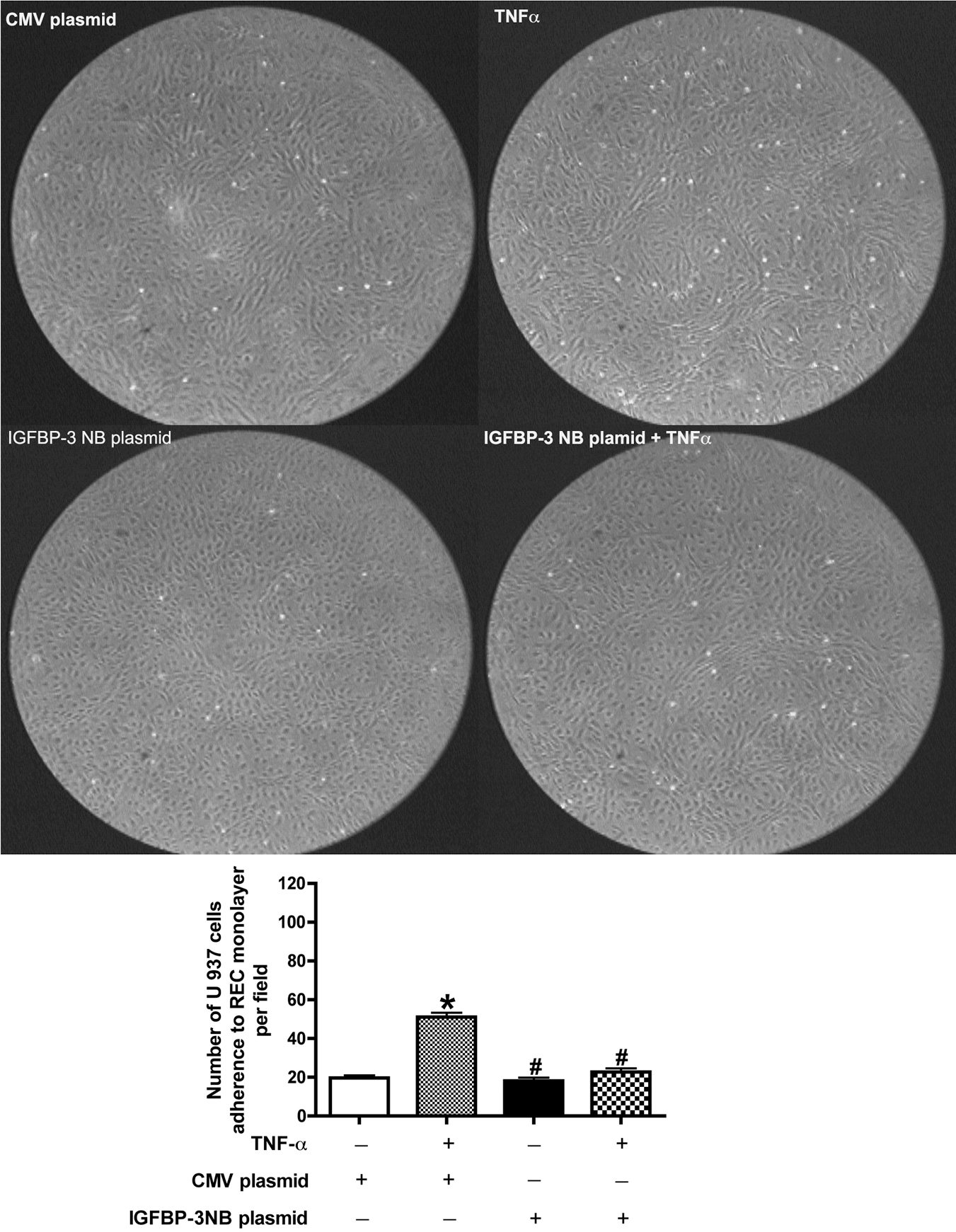 for at least 4 different fields of view. *p<0.05 versus control plasmid. #p<0.05 versus IGFBP-3 NB plasmid. $p<0.05 versus control plasmid +TNF-α. n=3, data are mean±SEM.