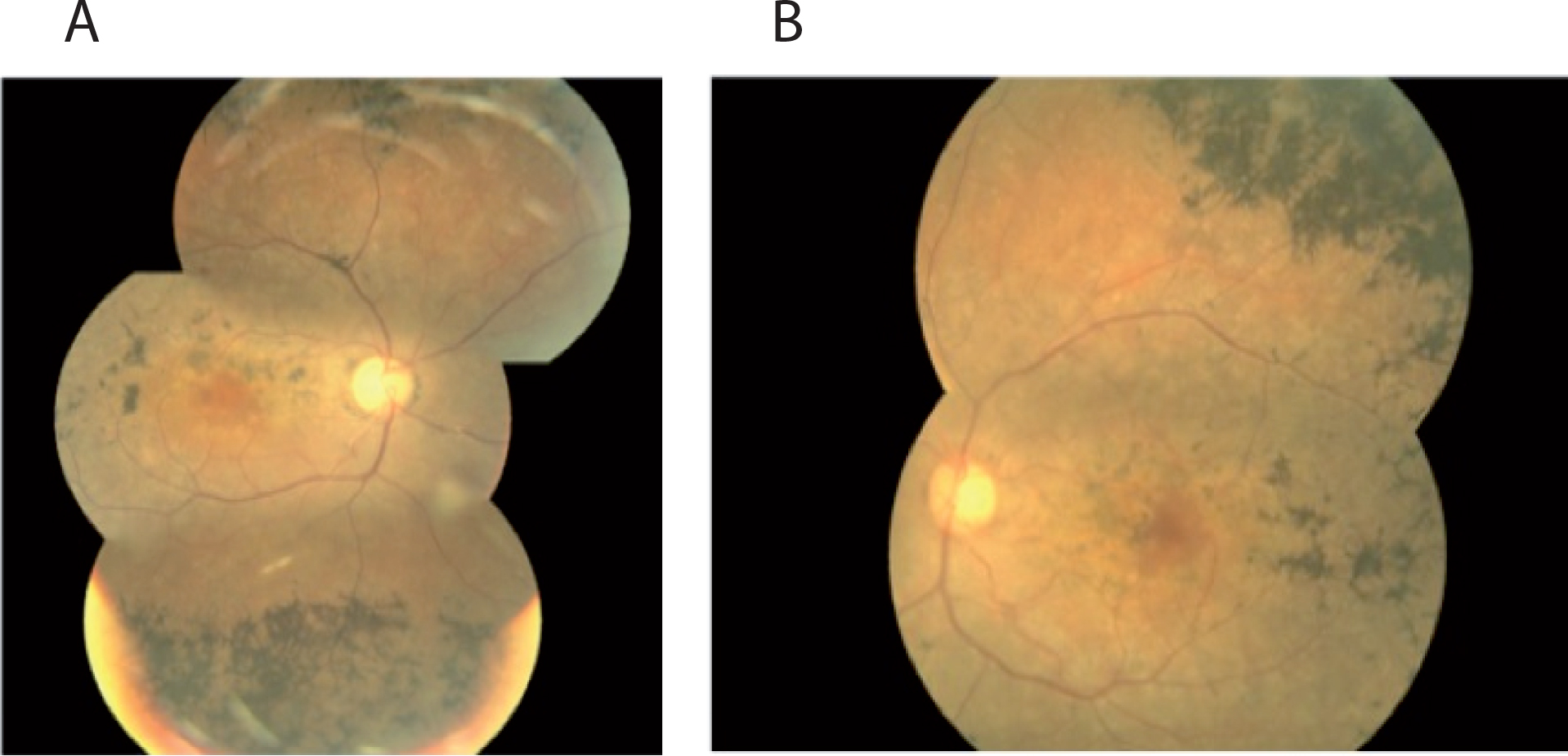 Figure 2. Color fundus photographs of the proband at 43 years of age. Left (A) and right (B) eyes showing typical advanced retinitis pigmentosa changes with bone spicule-like pigment deposits in the posterior pole