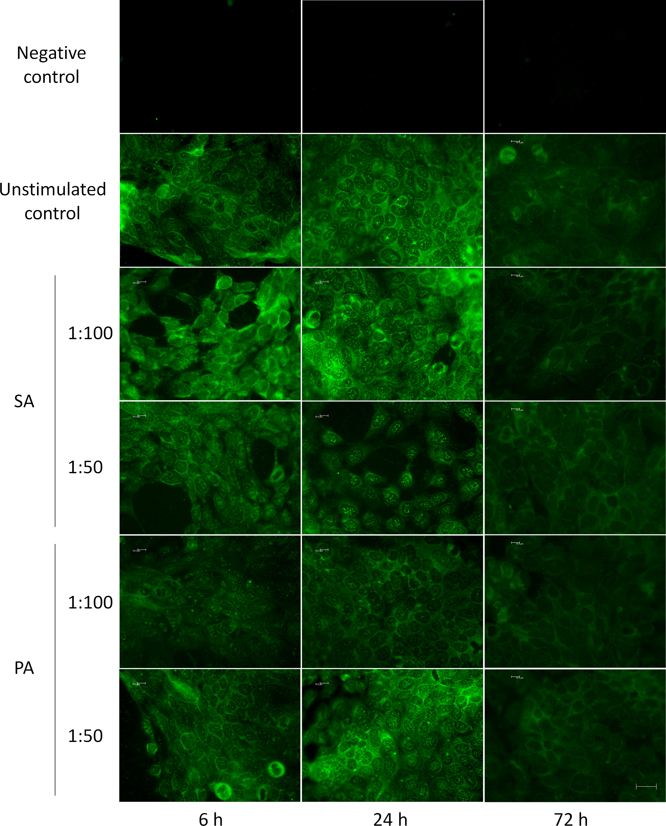 to Staphylococcus aureus (SA) and Pseudomonas aeruginosa (PA) supernatants at different dilutions and time points. Experiments were performed three times, and a representative image
