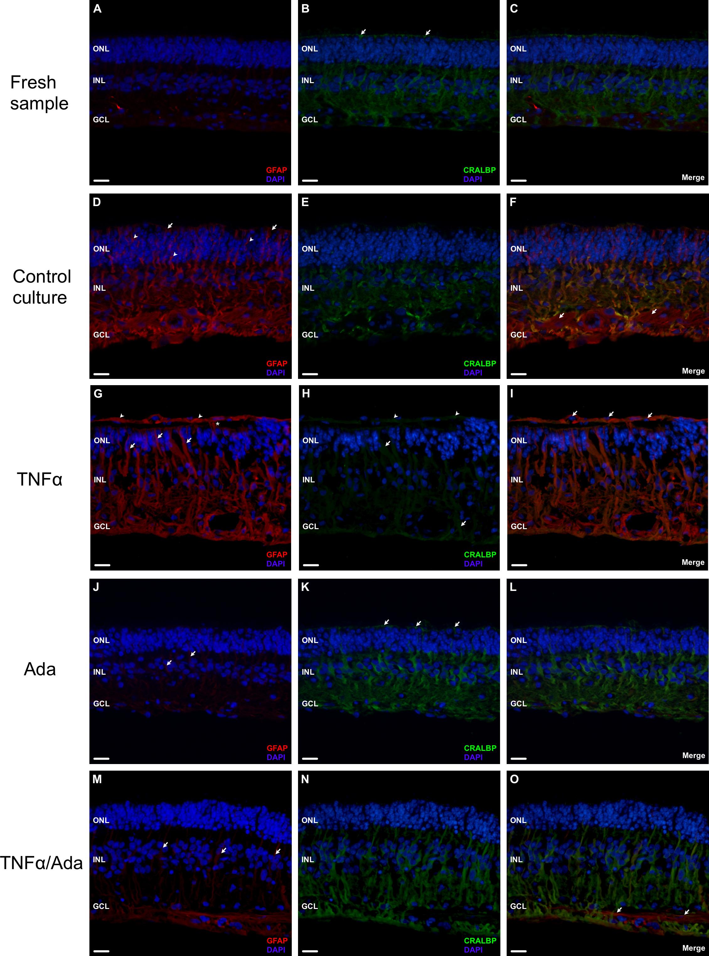 (TNFα/Ada; M–O), showed GFAP upregulation in astrocytes (O, arrows). Whereas GFAP spots appeared in the cytoplasm of Müller cells into the INL (M arrows), CRALBP was present mainly at the inner layers (N). Scarce retinal disorganization was apparent. Scale bars: 20 µm.