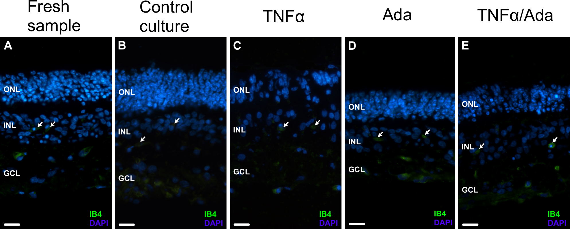 Figure 2. Retinal cells labeled with the lectin IB4 from Griffonia simplicifolia (IB4, green) in fresh neuroretinal samples (A) and experimental 9-day cultures (B–E). Ada: adalimumab treated culture; DAPI: 4’,6-diamino-2-phenylindole dihydrochloride staining (blue); INL: inner nuclear