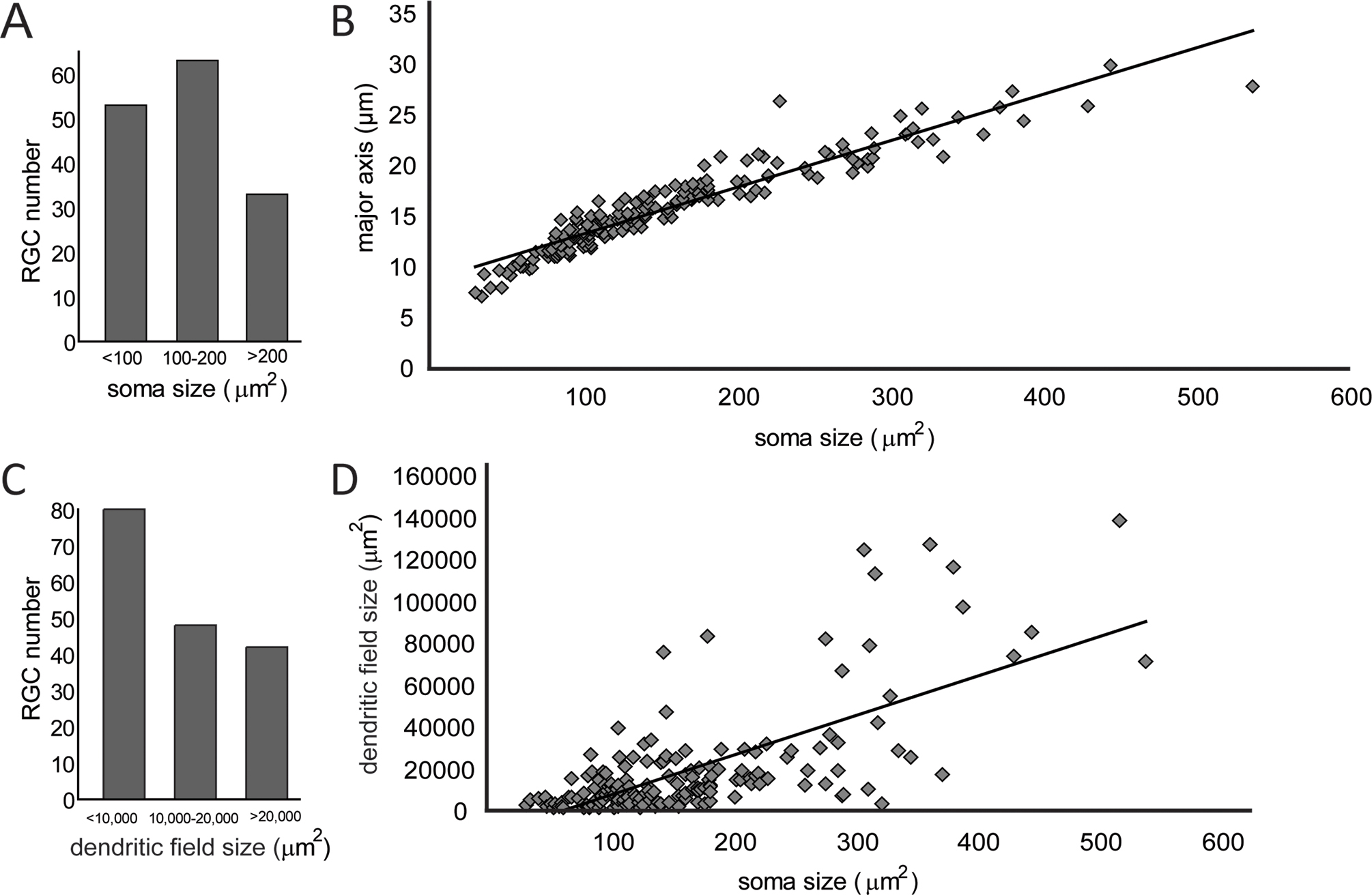 soma area size and dendritic field area size. Cells were grouped into three different groups according to (A) soma area: <100 μm2, 100–200 μm2, >200 μm2 as well as (C) dendritic field area (<10,000 μm2, 10,000–20,000 μm2, >20,000 μm2. Major axis length and the soma area sizes of RGCs correlate linearly (B), whereas soma area 1 sizes do not correlate linearly with dendritic field area sizes (D).