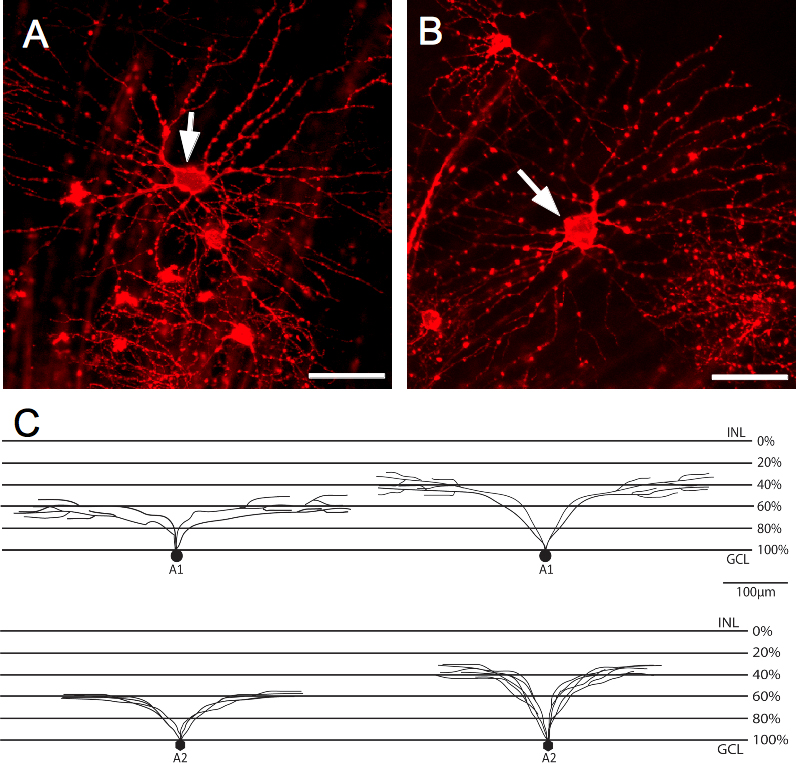 Figure 4. Representative pictures from the A cluster. A: The A1 subcluster contains cells with the largest somas and dendritic fields from the total population. B: The cells contained in the A2 subcluster display large somas and large dendritic fields. Scale bars are 50 µm. Arrows indicate