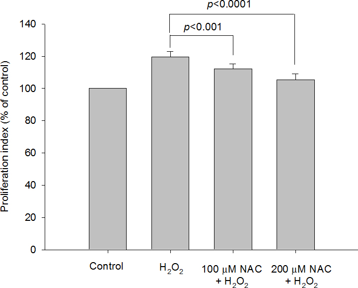 was not exposed to H2O2, and the mean values of cell proliferation are shown in the histogram. The pretreatment of NAC at 100 μM and 200 μM in GO