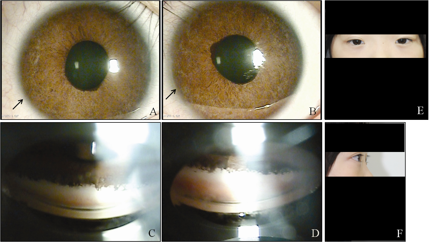 embryotoxon (black arrows) in both eyes, but Haab’s striae were observed only in the left eye. A, B: Gonioscopy showed open angles in both eyes with anterior insertion of the iris into the trabecular meshwork, prominent iris