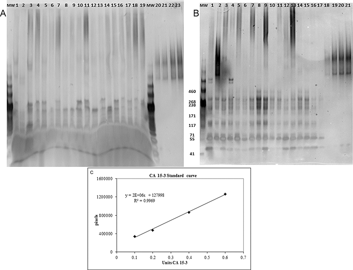 MUC1 standard (CA15–3; 0.1, 0.4, 0.8, and 1 unit). C: The sample regression curve (from A) was created by graphing applied concentration of MUC1 standard (CA15–3) against the optical density of the resulting band