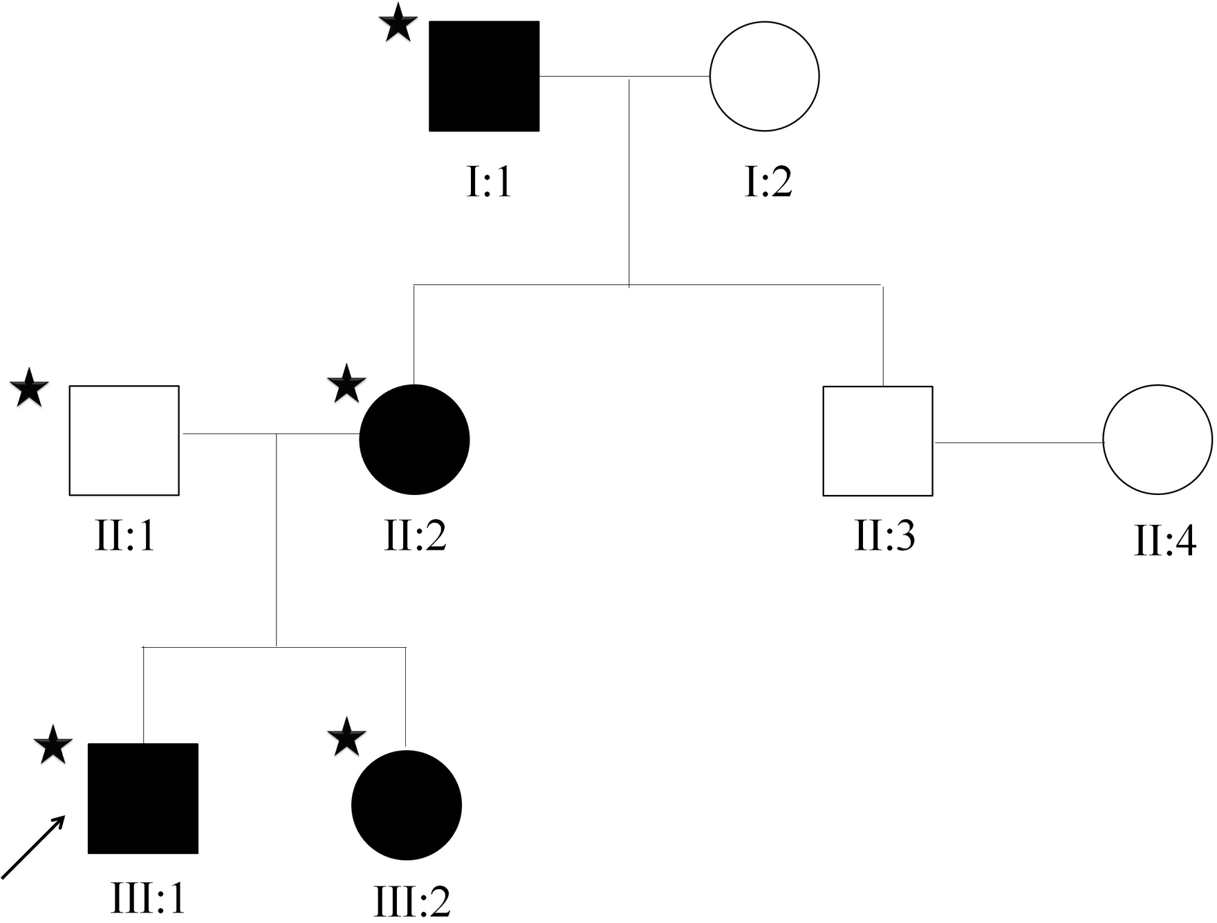 Pedigree of a Chinese family with Duane retraction syndrome. Squares: men; circles: women; filled symbols: affected; empty symbols: normal individual; arrow: the proband; star: DNA samples available for this study.