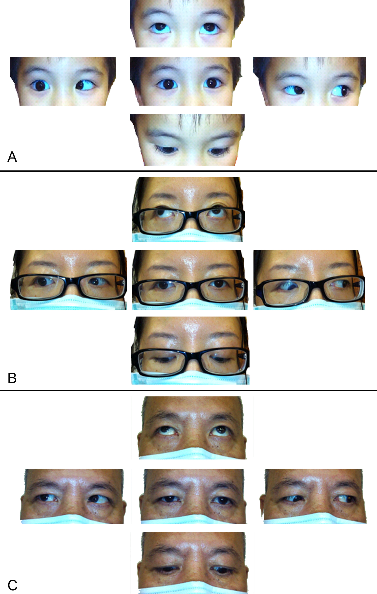 Figure 2. Clinical pictures showing photos of ocular gazes in proband III:1 (A: Four-year-old boy), II-2 (B. his mother) and I-1 (C. his grandfather). All shared similar features with limitation in right sided abduction, upshooting or downshooting of right
