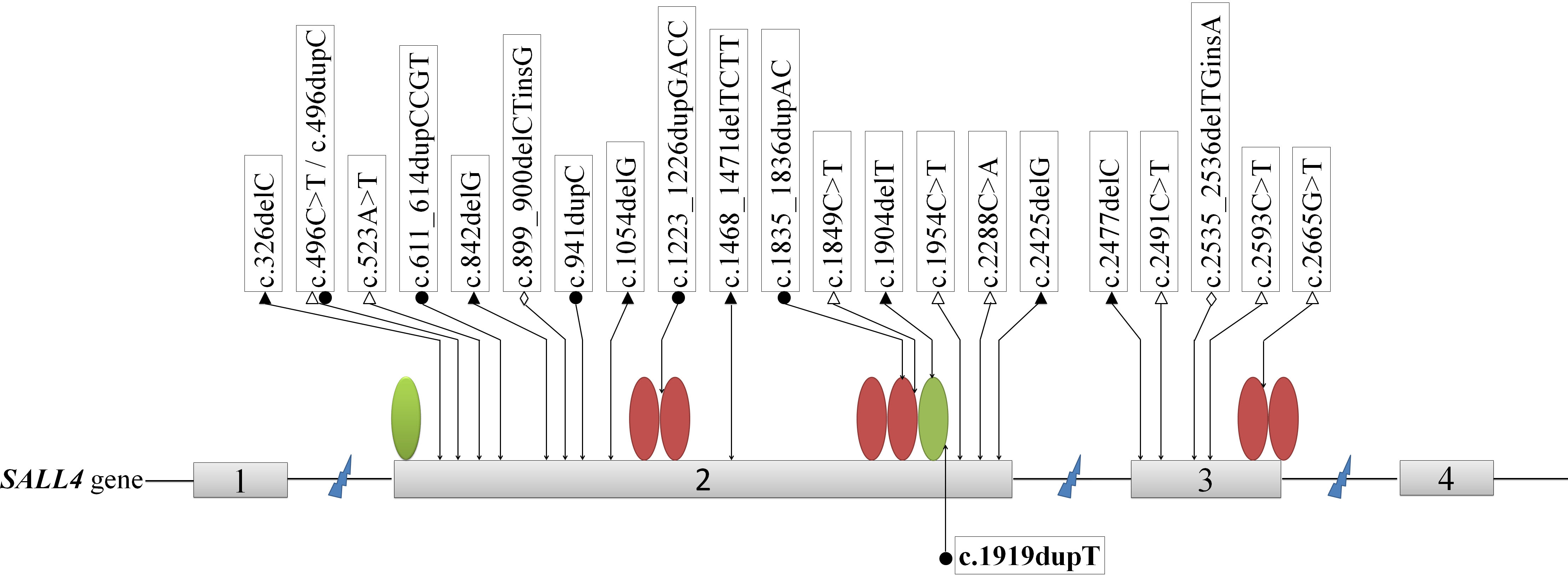 Figure 7. Schematic representation of the SALL4 gene/protein and localization of all mutations identified in Duane-related syndromes.