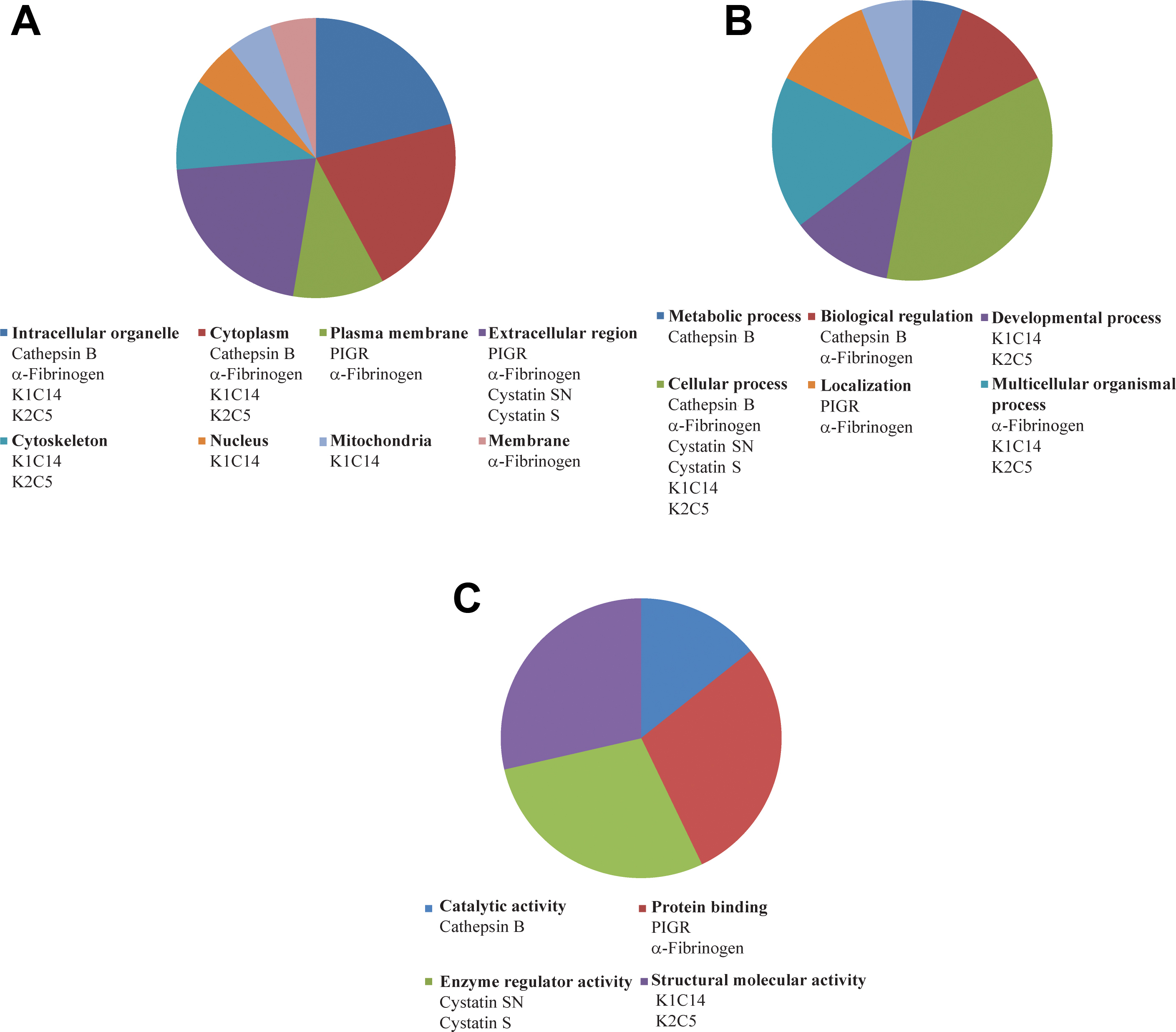 Figure 4. Ontology analysis of tear proteins. A: Cellular compartments of the proteins altered in tears from people with keratoconus (KC). B: Probable role in biologic processes of the proteins altered in tears from people with KC. C: Functions of the proteins altered in tears from people with KC.