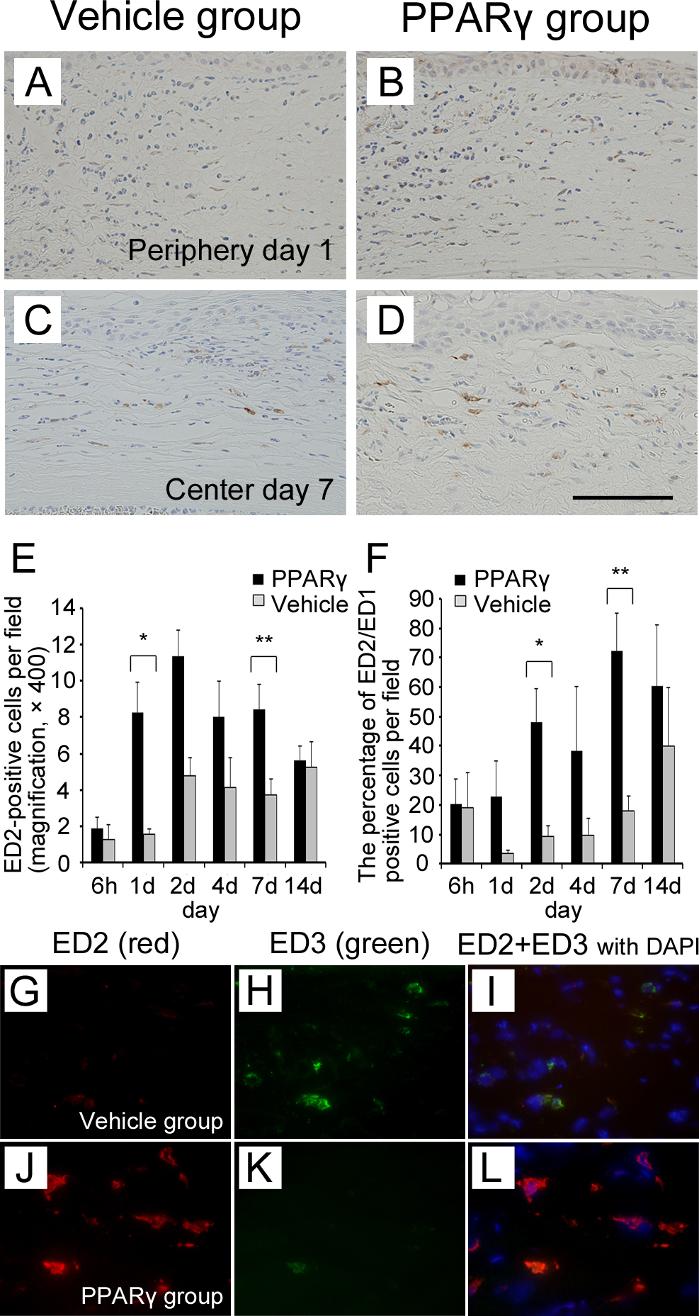 immunofluorescence studies with ED2 (red; M2 marker; G, J) and ED3 (green; activated macrophage marker; H, K) in the vehicle and PPARγ groups on day 7, the ED2-positive M2 macrophages were more prominent than the ED3-positive activated