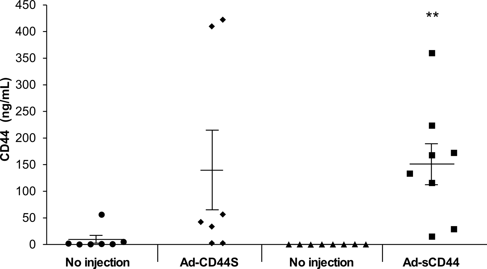 (n=7) or Ad-sCD44 (n=9) adenoviruses and their respective uninjected contralateral eyes. Data are expressed as mean ± SEM,
