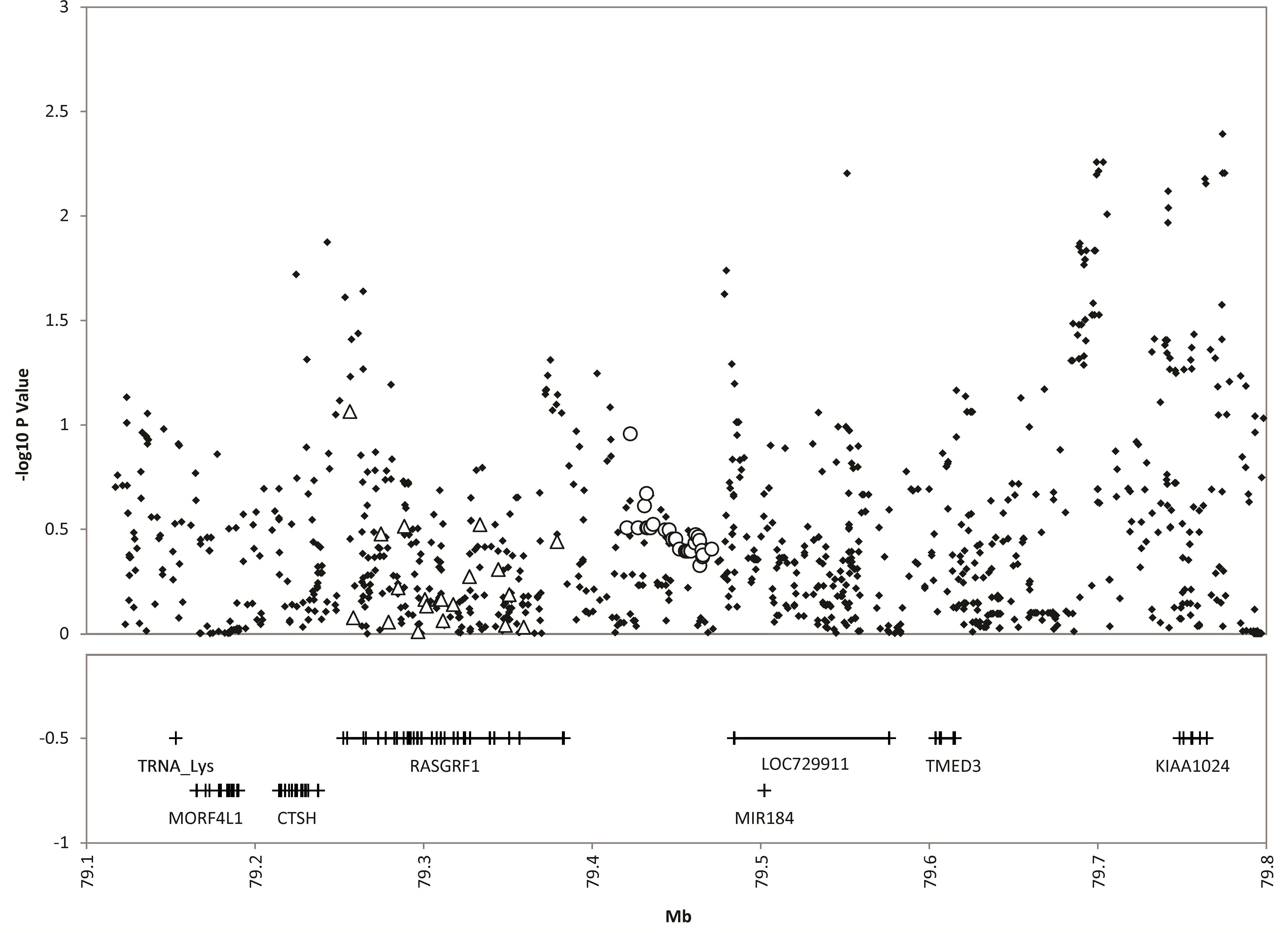 Figure 4. 15q25 replication single nucleotide polymorphisms from the Consortium for Refractive Error and Myopia replication study (circles),