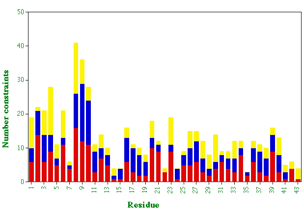 The distribution of the NOE derived constraints as a function of amino acid in the primary sequence of rhoIVe: