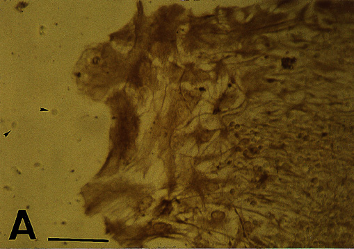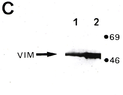 Return to Seigel et al A) P6 retinal cell outgrowth from explant, 6 days in vitro . Note fibrillar staining pattern of large, flat cells and processes. Round, neuronal-like cells remain unstained (arrowheads). B) R28 cells immunoreactive for vimentin also exhibit a fibrillar pattern. Scale Bar = 20 µm. C) Western immunoblot for vimentin: Lane 1) P6 retina, Lane 2) R28 cells. 2 minute chemiluminescent exposure.