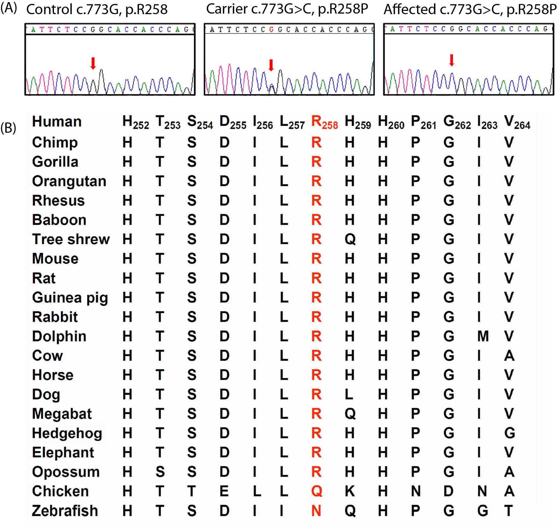 the AIPL1 c.773G>C mutation. B: Amino acid sequence alignment around the AIPL1 R258 residue (red) in 21 species ranging from human to zebrafish. R258 is part of a highly conserved region, suggesting that