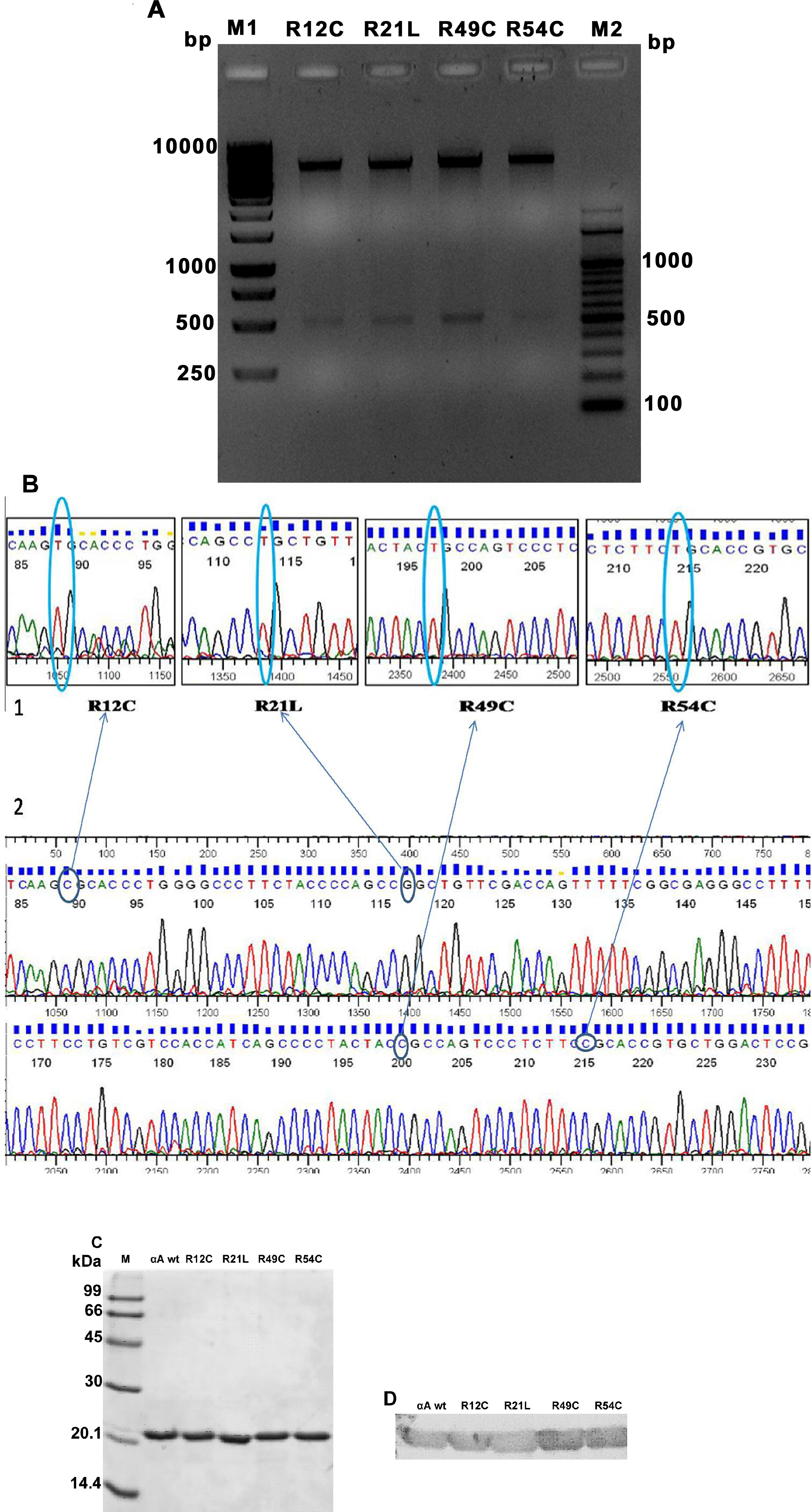 is the 100 bp DNA ladder and M2 1 kb DNA ladder. B: The boxed chromatogram represents the site-directed mutation at the specific points (circled) in the αA-crystallin gene.