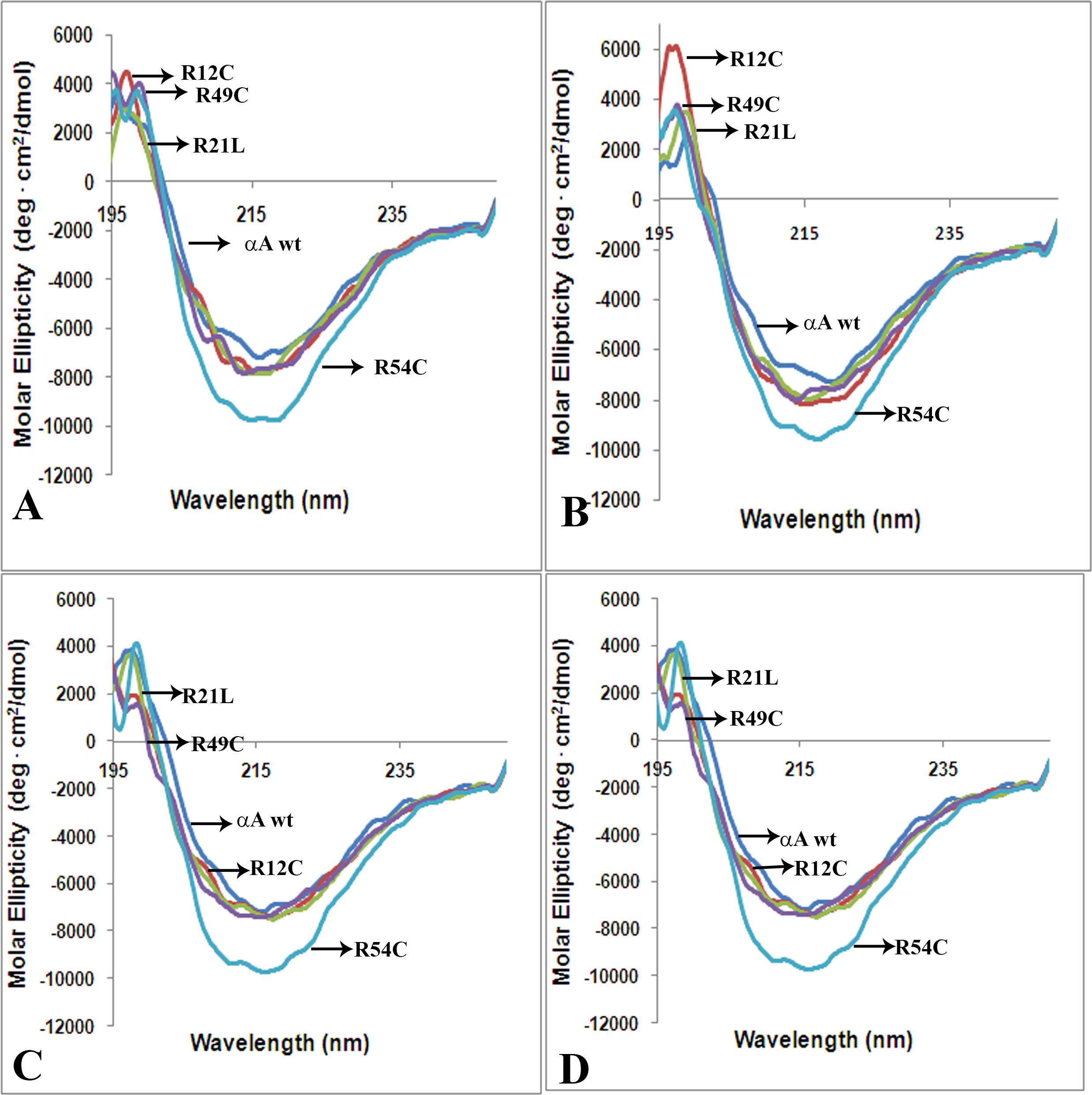 at (A) 0 kGy, (B) 0.5 kGy, (C) 1.0 kGy, and (D) 2.0 kGy dosages of GI. The secondary structure profile of the gamma irradiated (GI) αA-crystallin wt was stable at different