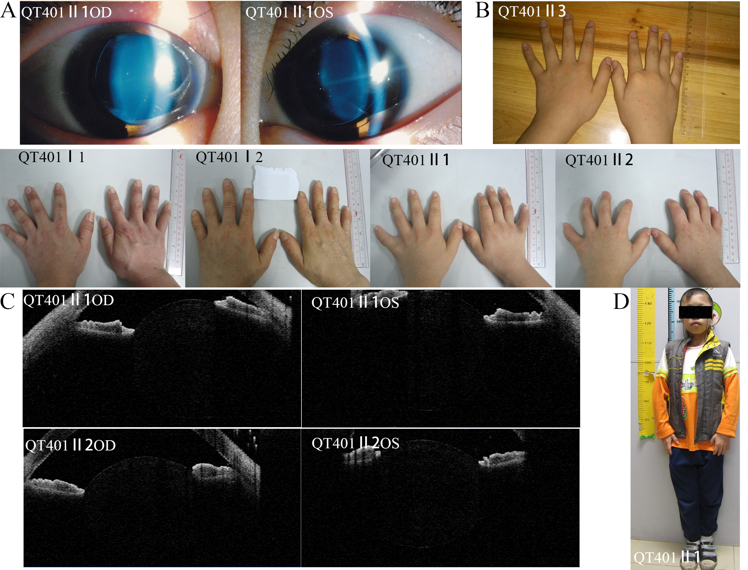 (A) ectopia lentis in QT401 II:1; (B) normal finger in QT401II3 and brachydactyly in QT401I:1, I:2, II:1, and II:2; (C) microspherophakia in QT401 II:1 and II:2 as shown by anterior segment optical coherence tomography; (D) short stature in QT401 II:1.