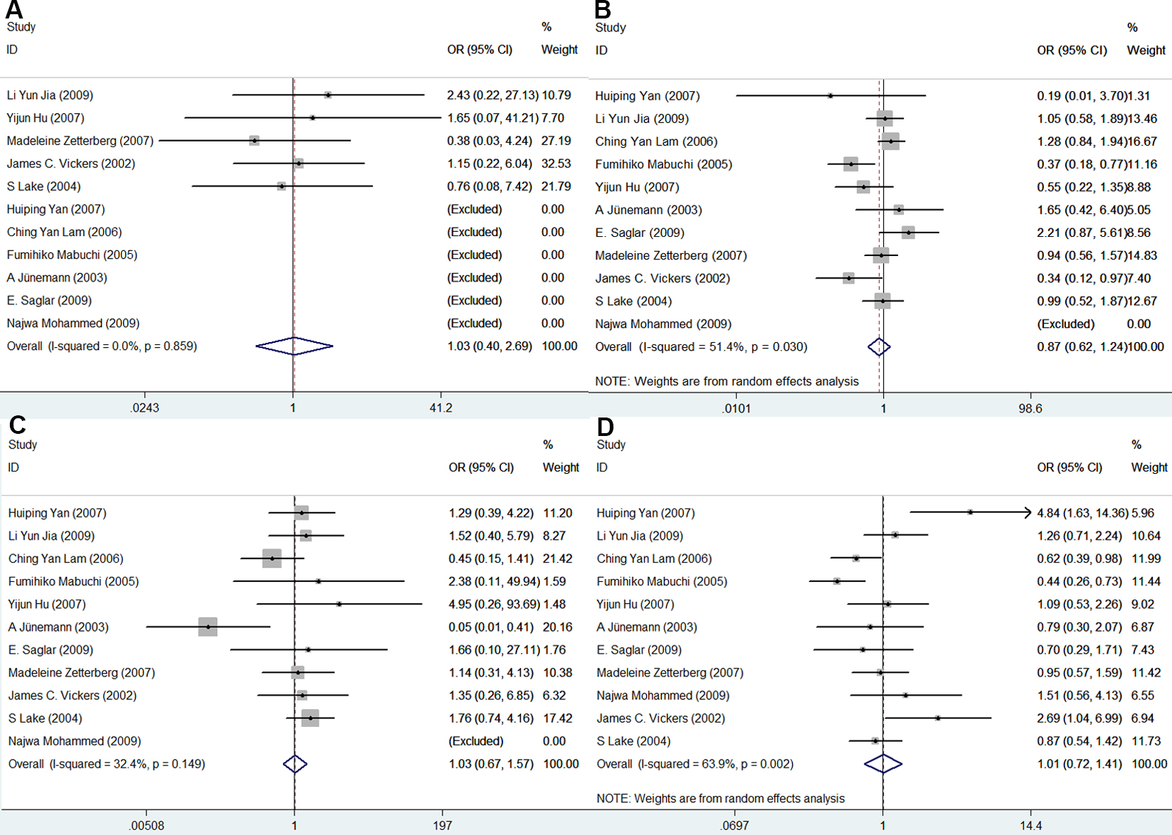 the pseudo 95% confidence limits (95% CI). A: Forest plot for APOE polymorphisms and POAG risk in the genetic model of ε2/ε2 vs. ε3/ε3. B: Forest plot for APOE polymorphisms and POAG risk in the genetic model of ε2/ε3 vs. ε3/ε3. C: Forest plot for APOE polymorphisms and POAG risk in the genetic model of ε2/ε4 vs. ε3/ε3. D: Forest plot for APOE polymorphisms and POAG risk in the genetic model of ε3/ε4 vs. ε3/ε3.