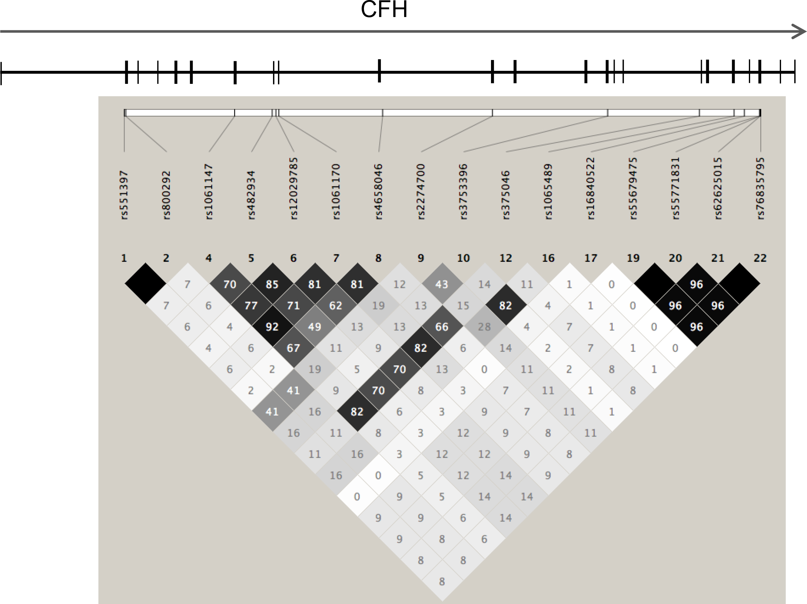 Figure 1. Linkage disequilibrium between the single nucleotide polymorphisms identified by resequencing in the CFH gene in Mexicans. The LD for SNPs is displayed in white for r2=0; shades of gray for 0<r2<1; and black for r2=1. The r2 values between any two SNPs is listed in the cross cells. At the top, a schematic representation of CFH shows exons and introns where are located each SNP.