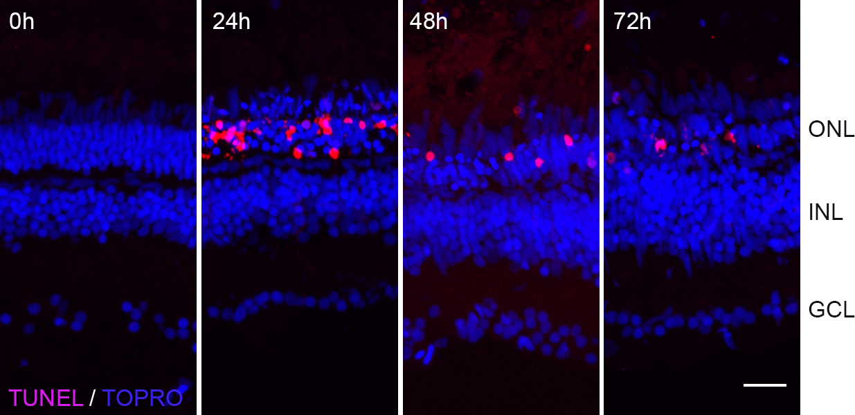 AB fish were collected at different times during light exposure and processed for TUNEL labeling (red). Nuclei were counterstained