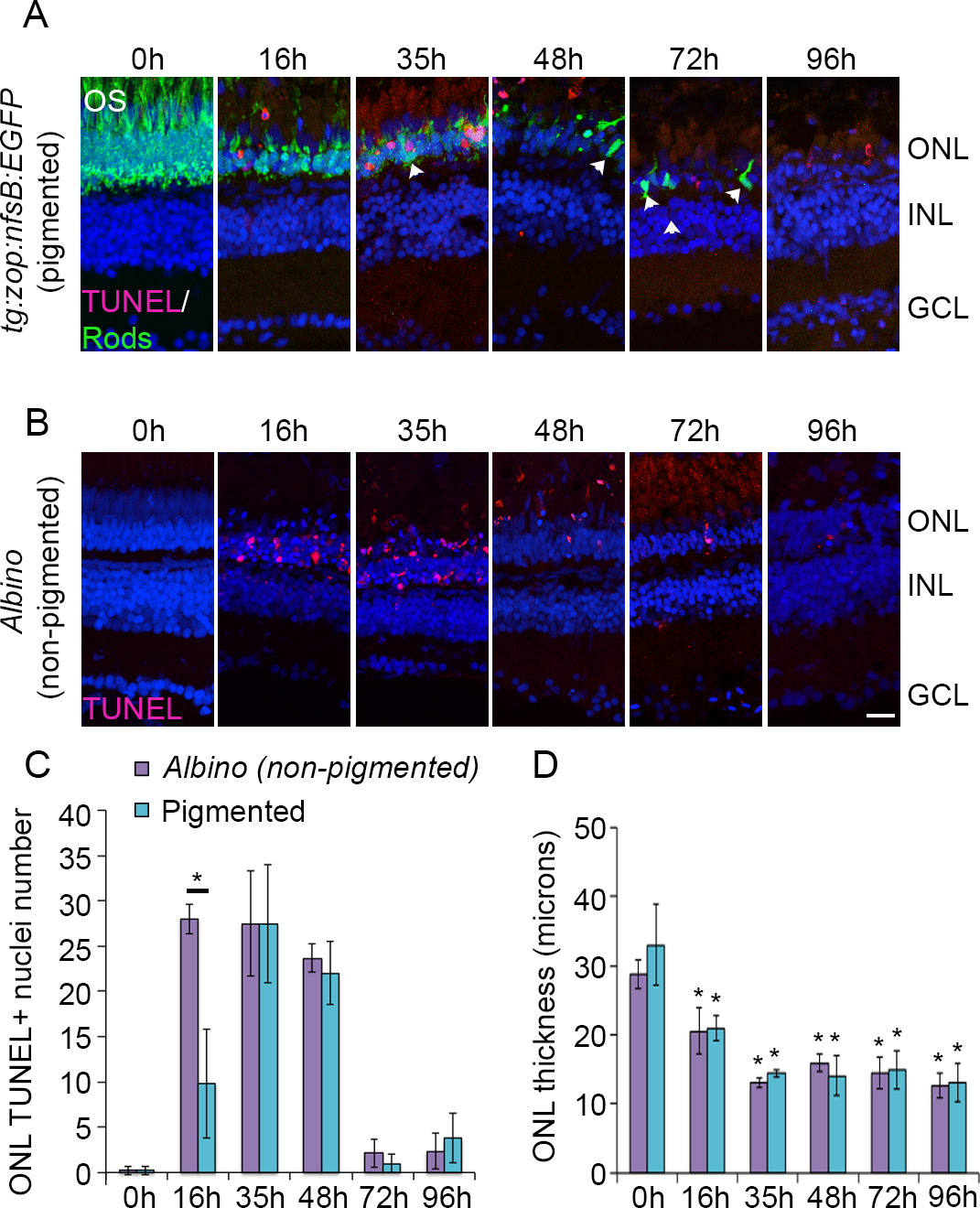 Dorsal retinas are shown. Arrowheads indicate rods that appear condensed and lack OS. C: Quantification of TUNEL labeling for albino and pigmented zebrafish. Data represent mean±standard deviation (SD); *, p<0.005,